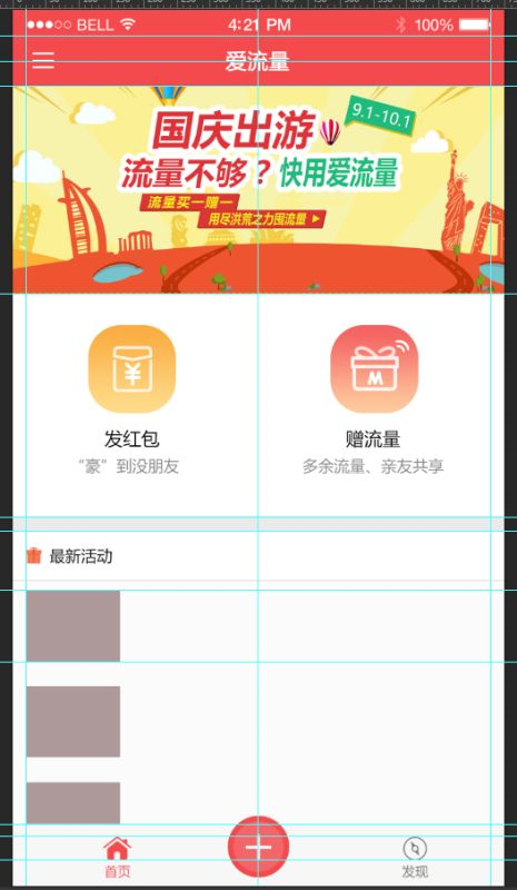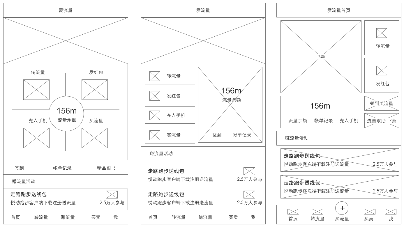 在前兩版的基礎(chǔ)上我們又加以思考、對(duì)功能的深入理解后,希望能契合產(chǎn)品定位并在布局和表現(xiàn)形式上與競(jìng)品區(qū)別,展現(xiàn)出愛(ài)流量的,并且經(jīng)過(guò)內(nèi)容的調(diào)整,增加用戶的粘性,所以我們?cè)O(shè)計(jì)了第三版,首頁(yè)重新布局,設(shè)計(jì)了三版交互原型。