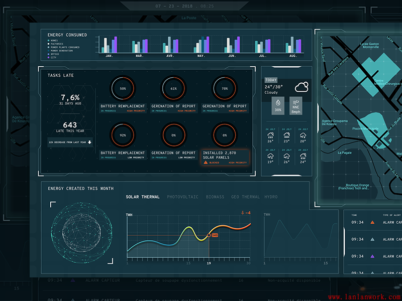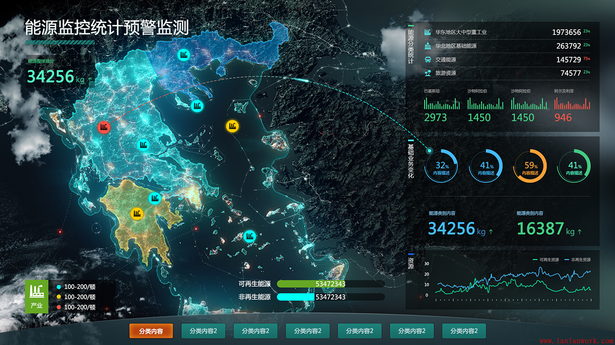 大屏可視化界面設(shè)計可謂是當(dāng)今行業(yè)、企業(yè)發(fā)展的見證,生動直觀地再現(xiàn)了行業(yè)、企業(yè)的全貌。不僅作為展示,方便了解、監(jiān)督;同時可以作為一個有效的管理平臺,帶來效益。大屏界面面向范圍廣,協(xié)同性好,易于被采用。下面幾個大屏的界面設(shè)計,沉穩(wěn)的背景上,加上亮色作為點綴和強調(diào)。既不失其風(fēng)格,又富有靈動性。