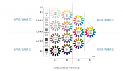 明度與純度聯(lián)系在一起研究,我們可以將其分為 4 種配色類(lèi)型,分別是高明度/高純度、高明度/低純度、低明度/高純度、低明度/低純度。