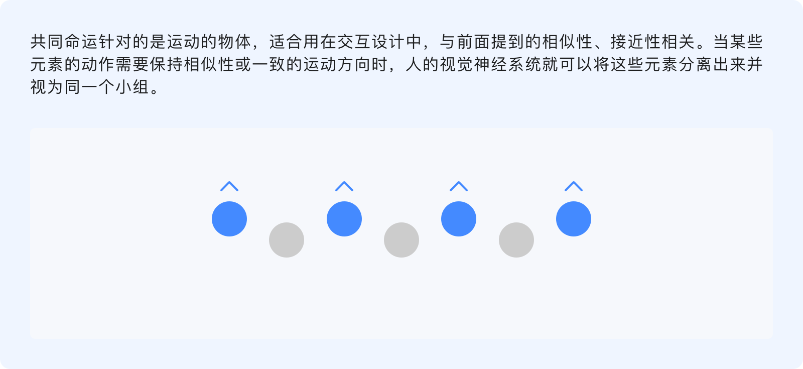 共同命運原則指出,人們傾向于將具有共同運動形式的事物感知為一個彼此相關(guān)的整體,無論元素之間的距離有多遠(yuǎn)、或其他屬性(形狀、顏色、大?。└鳟?,但只要沿著相同的方向、相同的速度運動,共同命運就會將其歸類。