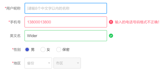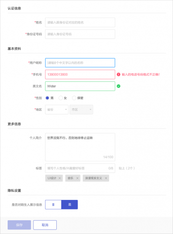 當輸入有誤時,盡量避免彈出框提示,可以直接對輸入框設(shè)計不同的狀態(tài)顯示默認狀態(tài)、選中狀態(tài)、錯誤狀態(tài)、成功狀態(tài)。