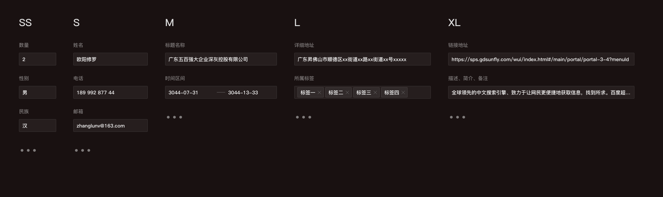 超短(XS):用于短數(shù)字、超短文本 短(S):適用于較短文本輸入,如個(gè)人信息(姓名、電話、郵箱等) 標(biāo)準(zhǔn)(M):默認(rèn)輸入框長(zhǎng)度,適用大多數(shù)情況 長(zhǎng)(L):適用較長(zhǎng)文本輸入,如網(wǎng)頁(yè)地址、標(biāo)簽組等 超長(zhǎng)(XL):適用超長(zhǎng)文本輸入如正文(描述信息、備注、摘要、介紹、備注)、超長(zhǎng)鏈接等選擇合適的輸入框?qū)挾瓤梢詫?duì)使用者產(chǎn)生一定的心理暗示從而來(lái)減輕使用者的心理負(fù)擔(dān),因?yàn)樵诳吹阶侄螛?biāo)題時(shí),心理都會(huì)產(chǎn)生對(duì)所填信息的預(yù)期,大概我要填寫什么,如果選用的輸入框?qū)挾炔缓线m一方面會(huì)對(duì)使用者造成一定的填寫負(fù)擔(dān),同時(shí)還會(huì)對(duì)用戶產(chǎn)生一定程度的誤導(dǎo)。比如:填寫戶籍所在地時(shí),如果輸入框給的太寬就會(huì)疑惑,到底應(yīng)該寫“xx省xx市”、還是應(yīng)該填到具體“省-市-區(qū)-街道-xx號(hào)”呢?當(dāng)遇到更復(fù)雜的場(chǎng)景和混排輸入框的情況,為了讓頁(yè)面呈現(xiàn)的內(nèi)容更加有序、整齊,可參照山歌系統(tǒng)的定義方式來(lái)定義5種梯度寬度,從而方便設(shè)計(jì)執(zhí)行和技術(shù)開發(fā)。比如定義為 A=超短(XS)的寬度;短(S)的寬度=2A+n;以此類推