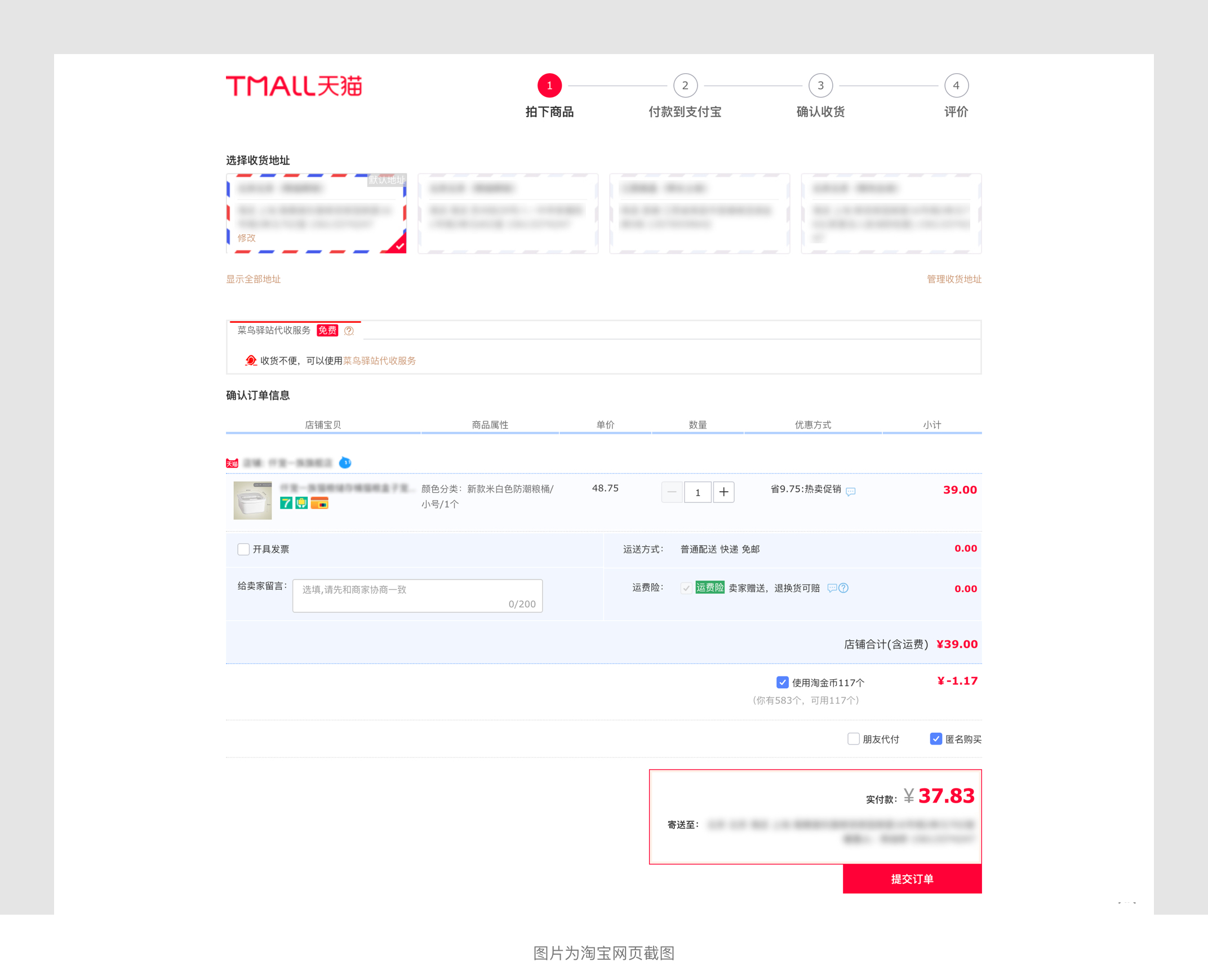 我們以淘寶來舉個(gè)典型的例子,淘寶屬于國(guó)民電商平臺(tái)也是亞洲較大的網(wǎng)上交易平臺(tái),提供各類優(yōu)質(zhì)商品。從平臺(tái)的特性來講,它以用戶下單并成交作為最終目標(biāo)。其中支付表單起著一個(gè)關(guān)鍵的作用,用戶從購(gòu)買到支付完成以分步形式進(jìn)行,第一步填寫基本信息并提交訂單,第二步選擇商品并選擇支付貨款至第三方,第三步買方確認(rèn)收貨并自動(dòng)打款給商家,第四步完成訂單并評(píng)價(jià)。在填寫表單時(shí)中間沒任何阻斷,用戶能很順利的按步驟完成訂單。淘寶支付表單屬于比較典型的分步表單。