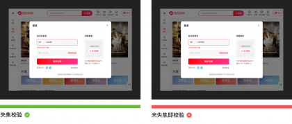為了避免用戶在提交時(shí)表單時(shí)出現(xiàn)大面積的報(bào)錯(cuò)問題,設(shè)計(jì)師可以使用實(shí)時(shí)校驗(yàn)的交互形式。如:在用戶輸入完成之后鼠標(biāo)失焦后進(jìn)行信息校驗(yàn),但是需要注意的是在實(shí)時(shí)校驗(yàn)時(shí)避免用戶還沒有輸入完成即出現(xiàn)校驗(yàn)誤導(dǎo)用戶,所以需要準(zhǔn)確判斷鼠標(biāo)是否失焦。如下圖所示為西瓜視頻登錄注冊(cè)場(chǎng)景下的截圖: