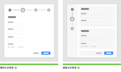 在設(shè)計(jì)師設(shè)計(jì)表單時(shí)可能業(yè)務(wù)場(chǎng)景復(fù)雜、字段較多,即使設(shè)計(jì)師把很多不必要的字段都刪除也解決不了根本問題。所以,這時(shí)候設(shè)計(jì)師需要將大型任務(wù)分解為一系列較小的任務(wù),使得表單更加的簡(jiǎn)潔。這種方式的好處是能將步驟以視覺的方式傳達(dá)給用戶數(shù)量、名稱、說明等信息,更加提高用戶滿意度并且能激勵(lì)繼續(xù)填寫。