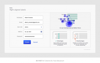 將表單標(biāo)簽放置在其對(duì)應(yīng)輸入字段的正上方,并垂直左對(duì)齊排列,用戶只需依次向下瀏覽即可看到標(biāo)簽與輸入字段兩個(gè)元素。其優(yōu)勢(shì)是橫向屏幕空間足夠,能夠比較友好的適配多語(yǔ)言適合非中國(guó)區(qū)業(yè)務(wù)表單使用。并且根據(jù)上面Matteo Penzo的時(shí)間表上看,頂部對(duì)齊的瀏覽和填寫的效率也是3種常規(guī)的對(duì)齊方式中較高的一種。不足點(diǎn)是會(huì)占用較多的縱向垂直屏幕空間,此外應(yīng)當(dāng)注意每組表單標(biāo)簽和輸入字段與其他字段組的間距,以免層級(jí)區(qū)分度不夠的問題。
