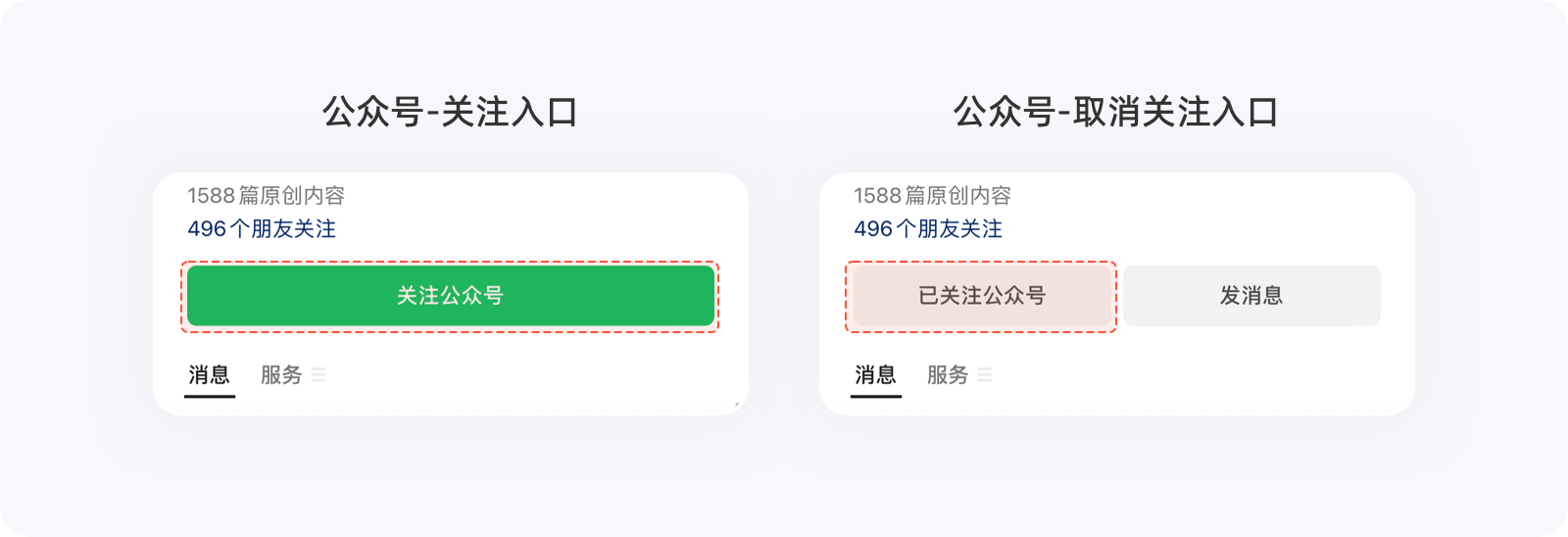 有時候,出于商業(yè)化的目的,同一個選項在二次操作時,產(chǎn)品會刻意增加用戶操作成本,以降低選擇效率,看似??硕傻姆聪虿僮?,卻一定程度地降低了用戶退出率,實則對產(chǎn)品有益。例如,在關(guān)注微信公眾號之前,非常醒目的關(guān)注按鈕觸手可及,可關(guān)注之后,弱化的幽靈按鈕及文案,很難一眼看出這就是取消關(guān)注入口,需要用戶花費額外的時間去理解或試錯方可取關(guān),這么做能降低公眾號粉絲的取關(guān)量。為公眾號留住粉絲,更是對內(nèi)容認可的一種支持,后面的良性循環(huán)無需多講。