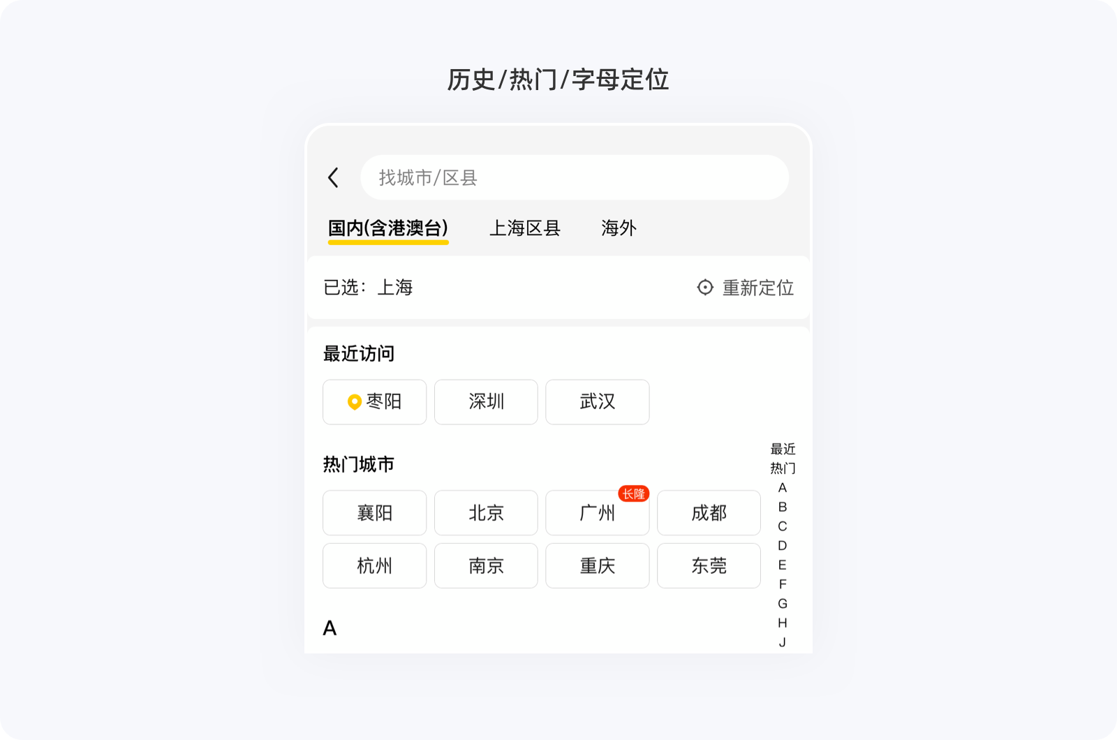 另外,我們在選擇地址時,如果將所有城市一股腦平鋪在界面上,用戶想要選擇自身所需,則需要花費大量的時間。對城市進行了分類分層,以及有了搜索歷史、熱門城市以及右側(cè)的首字母索引后,用戶就能通過不同維度快速找到想找的城市,選擇效率直線上升。