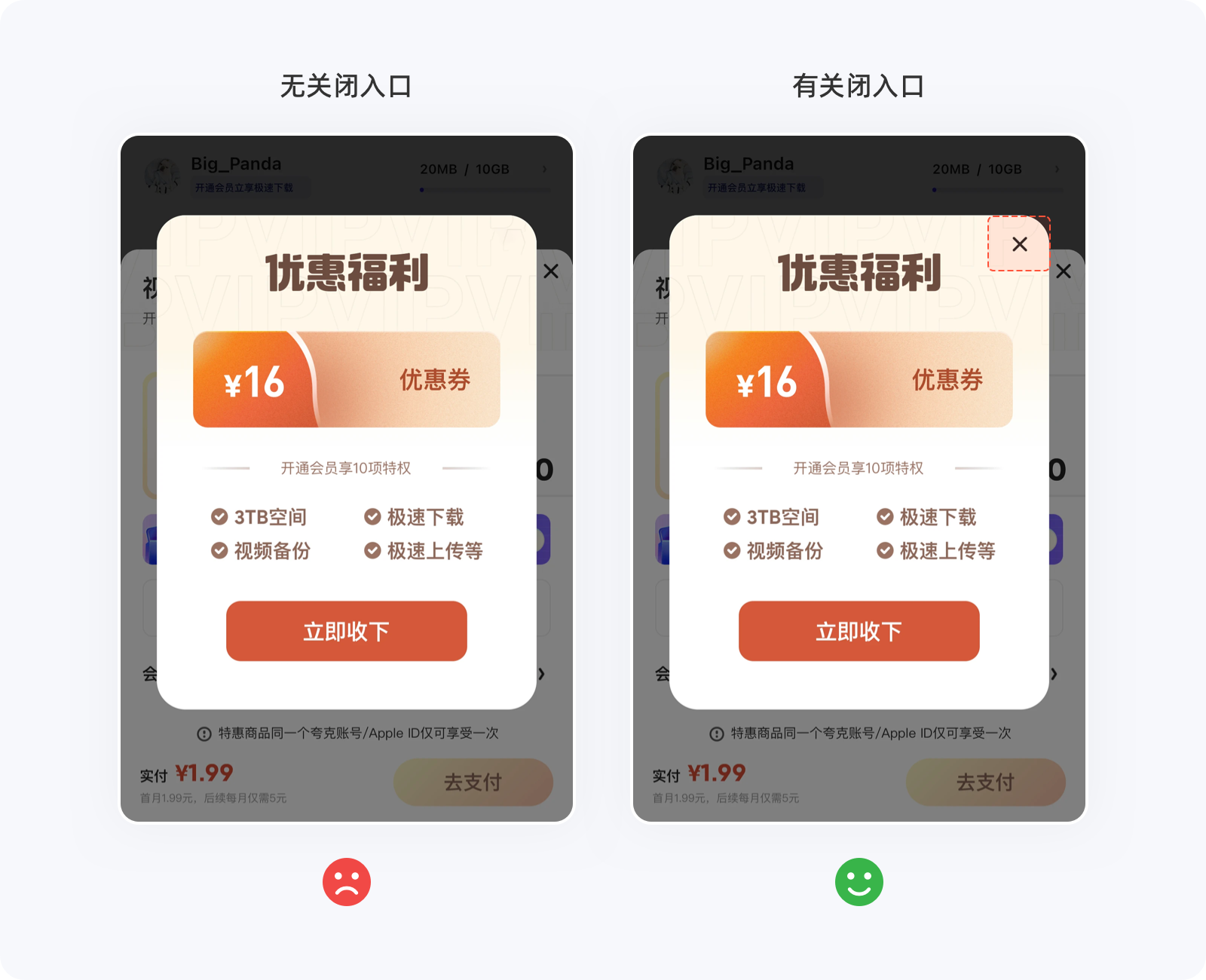 希克定律要做的是通過減少用戶做決定的時間,來提升轉(zhuǎn)化率以及用戶體驗,但不管在什么情況下,用戶都希望自己還擁有選擇的權(quán)利,如果設(shè)計師自作聰明的將選項減到只剩一個,就相當于告知用戶必須接受,那么用戶就有種被強制、綁架的感覺,只會存在兩個結(jié)果:①被你的產(chǎn)品拿捏、②離開你的產(chǎn)品,筆者相信第一種可能性的概率極低,畢竟同類型的產(chǎn)品并不是只有你一家(壟斷除外)。如下圖的彈窗,用戶即便不愿意進入任務(wù)流程,可別無選擇,只能進入后再返回才能回到原位,這種做法無端增加用戶的操作成本,極易引起反感情緒。不管產(chǎn)品如何希望用戶轉(zhuǎn)化,切不可強制他們接受,需要給用戶留一條返回的“路”,即便不那么起眼,至少還有選擇的權(quán)利。