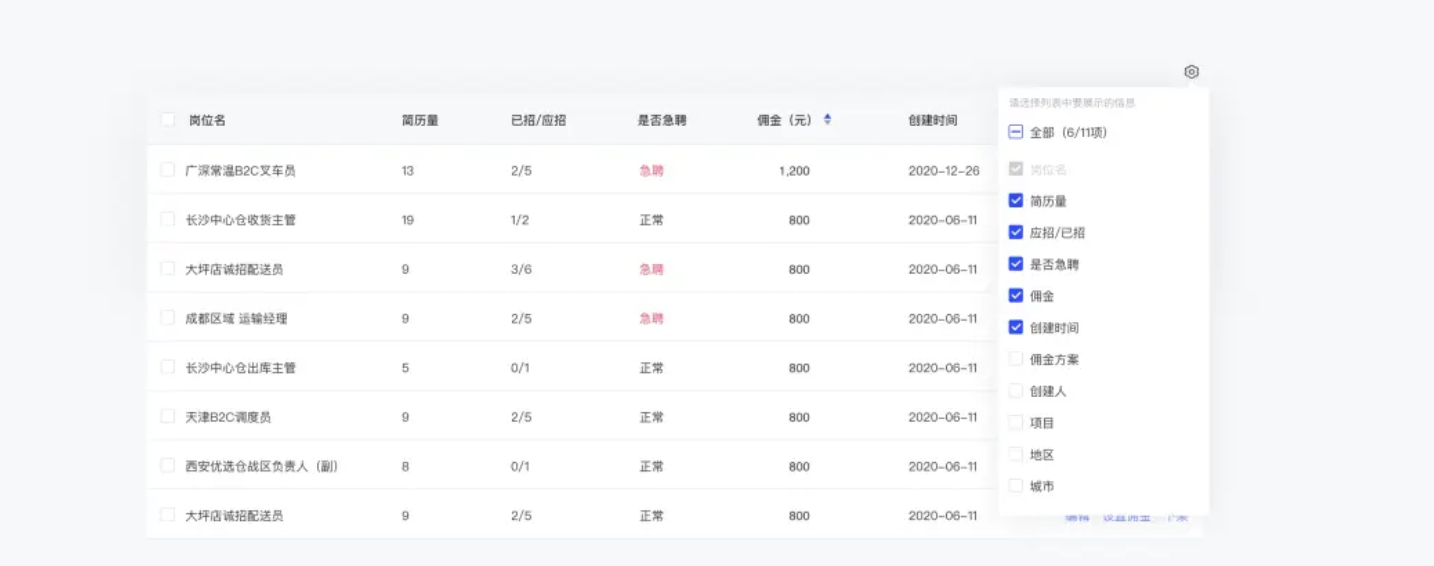 如果不同用戶想看到的信息側(cè)重不同,可以讓用戶自定義列的展示。在默認(rèn)情況下僅展示最常用、最重要的幾個(gè)指標(biāo)(如下圖)。這樣做的好處是:首先,用戶能在表格上方看到所有的指標(biāo)名稱,避免了原來(lái)需要橫向拖拽才能瀏覽到所有指標(biāo)的情況;其次,用戶可以根據(jù)自己的需要,自由的選擇顯示所需指標(biāo),隱藏不必要指標(biāo),減少干擾。但需注意系統(tǒng)應(yīng)記住用戶上一次的自定義列設(shè)置,減少用戶重復(fù)操作。