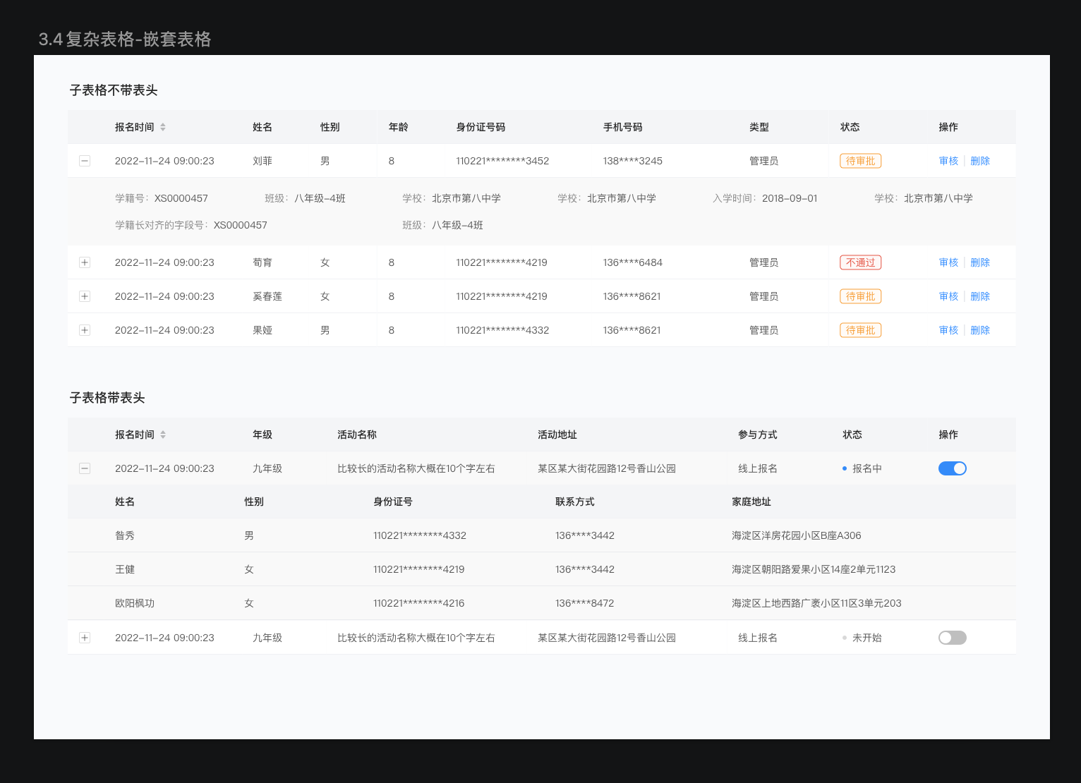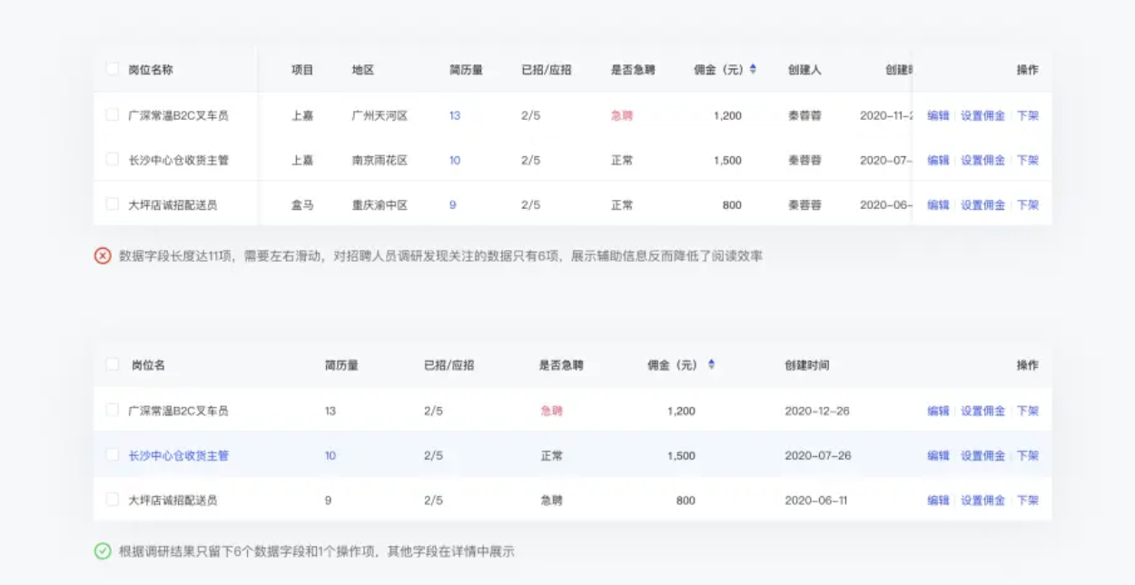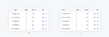 表格設(shè)計(jì)中一定不要使用過多的顏色區(qū)做狀態(tài)或操作的區(qū)分,過多的顏色細(xì)分會(huì)使表格變得更加混亂,影響用戶體驗(yàn)。對(duì)狀態(tài)的區(qū)分,僅用輕量的顏色區(qū)分即可,操作欄保持主色按鈕色。