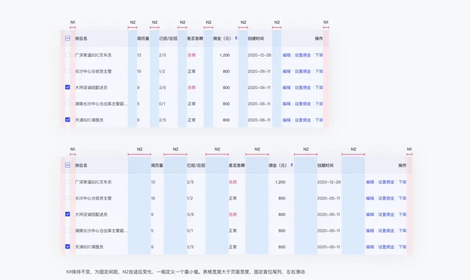 合適的填充和邊距對(duì)于視覺設(shè)計(jì)至關(guān)重要,以保證易讀性。定義列的間距時(shí),我通常的做法是N1保持不變,將N2定義一個(gè)最小值,N2再根據(jù)表格的寬度自適應(yīng)變化。表格主要適配到這個(gè)最小寬度,這一步驟通常的設(shè)計(jì)系統(tǒng)的初期就要完成,一方面可根據(jù)自己項(xiàng)目目前情況,按照導(dǎo)航寬度等固定尺寸確定最小的表格寬度,這樣在處理最小尺寸時(shí),可以有一個(gè)明確的邊界,同時(shí)能與開發(fā)同學(xué)進(jìn)行理解溝通。當(dāng)表格寬度大于頁(yè)面寬度,固定首尾列,左右滑動(dòng)。