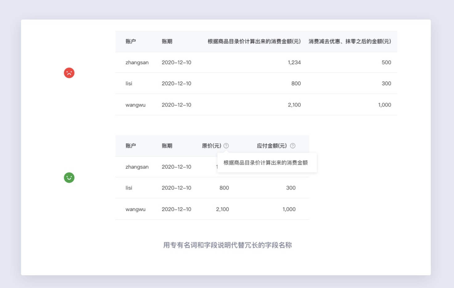 當(dāng)字段名稱過長(zhǎng),又必須展示,才能有效的理解字段含義時(shí)。我們可以定義一個(gè)專有名詞代替,并且在字段名稱后使用添加字段說明的形式,來(lái)對(duì)字段加以說明。這樣一來(lái)用戶既可以清晰的理解字段含義,又可以在有限的頁(yè)面空間下獲取到更多的數(shù)據(jù)信息。