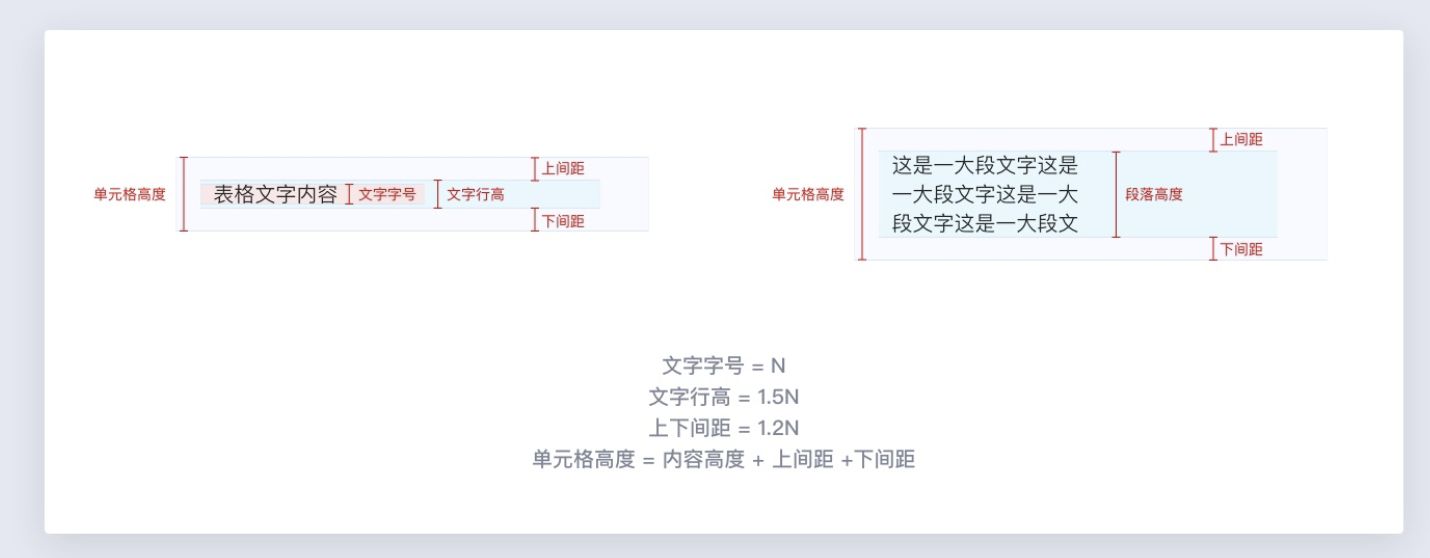 在開發(fā)同學(xué)的眼中,單元格高度=內(nèi)容高度+上間距+下間距,在實(shí)現(xiàn)設(shè)計(jì)稿時(shí),通常也是按照這個(gè)方式來(lái)寫的,而不是像設(shè)計(jì)同學(xué)一樣按照文字的尺寸來(lái)計(jì)算間距。其中,文字行高建議設(shè)為字號(hào)的1.5倍,上下間距設(shè)為字號(hào)的1.2倍。
