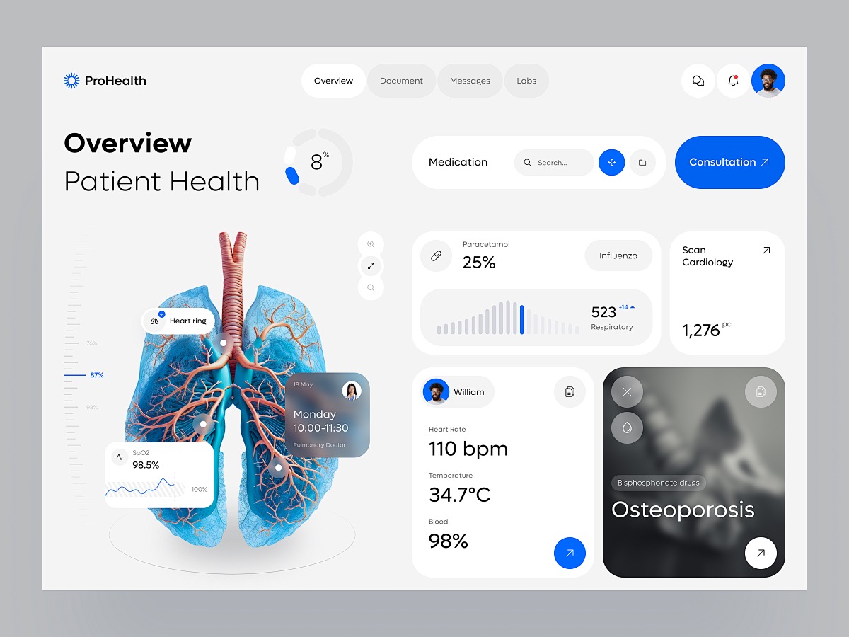 針對(duì)患者的醫(yī)療 UI 設(shè)計(jì),功能重點(diǎn)在于信息查詢與服務(wù)獲取?;颊咝枰軌蚍奖愕夭樵冏约旱木驮\記錄、檢查報(bào)告、費(fèi)用明細(xì)等信息,因此在患者端的醫(yī)療 APP 或醫(yī)院官網(wǎng)界面上,應(yīng)設(shè)置專門(mén)的信息查詢?nèi)肟冢⒁郧逦锥姆绞匠尸F(xiàn)數(shù)據(jù)。同時(shí),提供在線預(yù)約掛號(hào)、繳費(fèi)、藥品配送等服務(wù)功能,實(shí)現(xiàn)就醫(yī)流程的線上化,減少患者排隊(duì)等待的時(shí)間。此外,一些健康管理功能也受到患者的歡迎,如個(gè)人健康檔案管理、疾病預(yù)防知識(shí)推送、康復(fù)訓(xùn)練指導(dǎo)等。