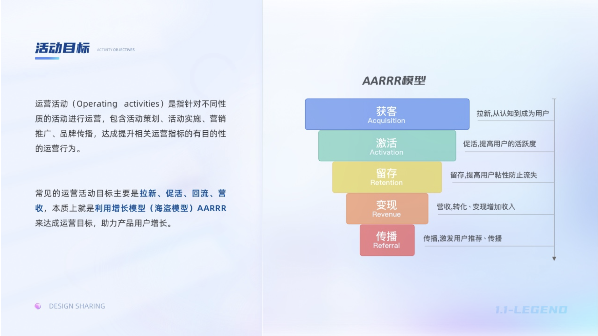 運(yùn)營活動(dòng)(Operating activities)是指針對不同性質(zhì)的活動(dòng)進(jìn)行運(yùn)營,包含活動(dòng)策劃、活動(dòng)實(shí)施、營銷推廣、品牌傳播,達(dá)成提升相關(guān)運(yùn)營指標(biāo)的有目的的運(yùn)營行為。為了更好的達(dá)成既定目標(biāo),項(xiàng)目立項(xiàng)后我們需要了解此次運(yùn)營活動(dòng)的目標(biāo),以目標(biāo)展開設(shè)計(jì)策略和設(shè)計(jì)實(shí)施。常見的運(yùn)營活動(dòng)目標(biāo)主要是拉新、促活、回流、營收,本質(zhì)上就是利用增長模型AARRR來達(dá)成運(yùn)營目標(biāo),助力產(chǎn)品用戶增長。