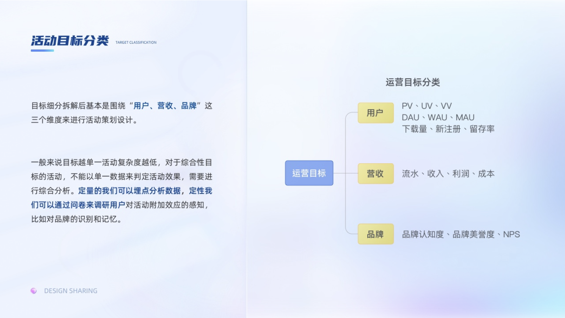 目標(biāo)的細(xì)分拆解后,基本都是圍繞“用戶、營收、品牌”這三個(gè)維度來進(jìn)行活動(dòng)策劃設(shè)計(jì)。一般來說目標(biāo)越單一活動(dòng)復(fù)雜度越低,目標(biāo)綜合性越高,越需要調(diào)動(dòng)不同類型用戶參與,活動(dòng)的復(fù)雜度就越高。對于綜合性目標(biāo)的活動(dòng),不能以單一數(shù)據(jù)來判定活動(dòng)效果,需要進(jìn)行綜合分析。定量的我們可以埋點(diǎn)分析數(shù)據(jù),定性我們可以通過問卷來調(diào)研用戶對活動(dòng)附加效應(yīng)的感知,比如對品牌的識(shí)別和記憶以及NPS(凈推薦值)。