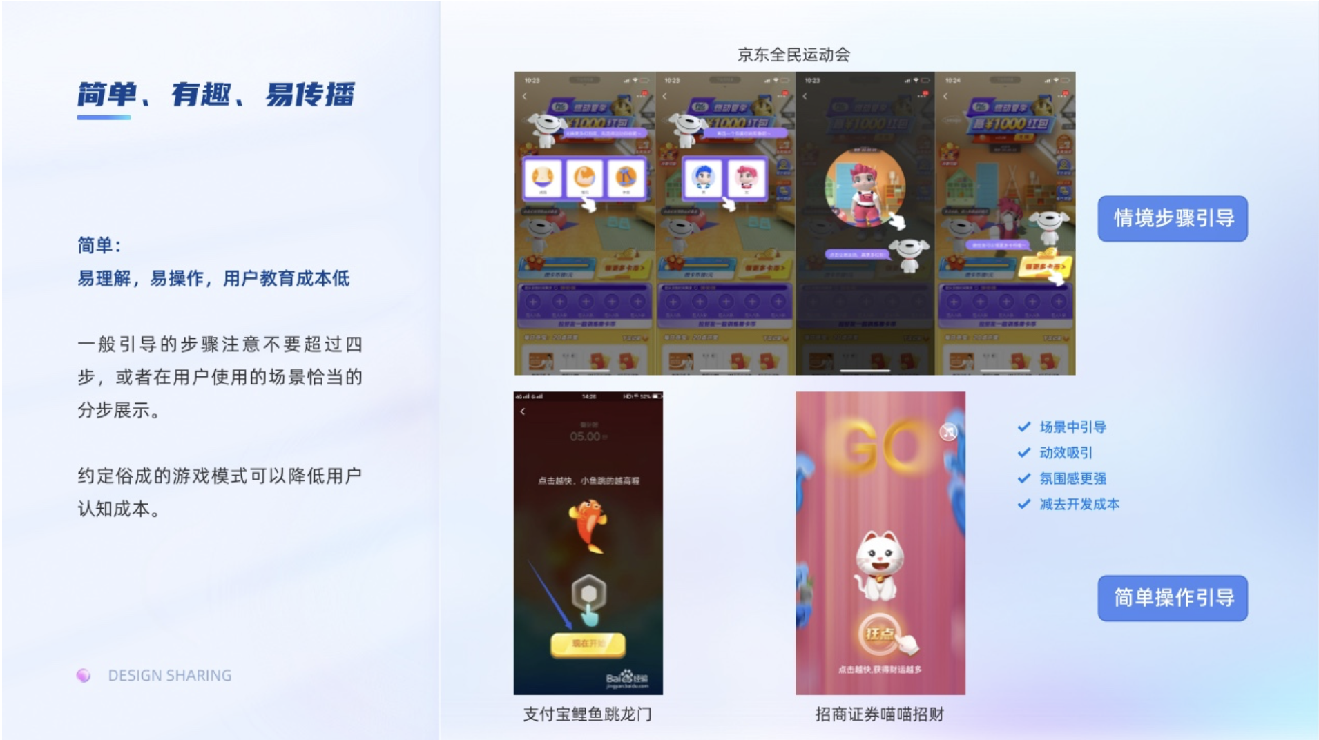 簡單:是指用戶易理解,教育成本低,操作簡單。在運(yùn)營設(shè)計(jì)中一般我們會(huì)與游戲結(jié)合,在此我稱為游戲運(yùn)營。在游戲運(yùn)營的設(shè)計(jì)中,如果不是一個(gè)約定俗成用戶都熟悉的游戲任務(wù),教育用戶如何操作的成本是相對較高的,需要有詳細(xì)的操作引導(dǎo)。一般引導(dǎo)的步驟注意不要超過四步,或者在用戶使用的場景恰當(dāng)?shù)姆植秸故?。比如鯉魚跳龍門游戲操作就比較簡單,引導(dǎo)只需要一個(gè)簡單的提示;而京東全民運(yùn)動(dòng)會(huì)作為大型活動(dòng)比較復(fù)雜,引導(dǎo)步驟較多,對一步分用戶來說認(rèn)知成本高就不會(huì)參與活動(dòng)。