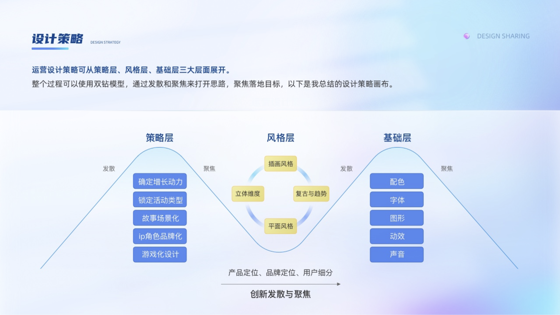 運(yùn)營設(shè)計(jì)策略可從策略層、風(fēng)格層、基礎(chǔ)層三大層面展開。整個(gè)過程可以使用雙鉆模型,通過發(fā)散和聚焦來打開思路,聚焦落地目標(biāo),以下是我總結(jié)的設(shè)計(jì)策略畫布。