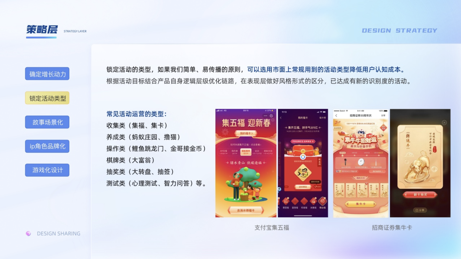 確定增長動(dòng)力后,需要鎖定活動(dòng)的類型。如果我們簡單、易傳播的原則,可以選用市面上常規(guī)用到的活動(dòng)類型降低用戶認(rèn)知成本,對于一些比較有名的活動(dòng),像支付寶集五福,其本質(zhì)就是通過完成運(yùn)營任務(wù)來收集某種虛擬物品,再由集齊的虛擬物品變現(xiàn)紅包完成用戶利益激勵(lì)。設(shè)計(jì)時(shí)不能完全照搬,既要根據(jù)活動(dòng)目標(biāo)結(jié)合產(chǎn)品自身邏輯層級優(yōu)化鏈路,也要在表現(xiàn)層做好風(fēng)格形式的區(qū)分,已達(dá)成有新的識(shí)別度的活動(dòng)。