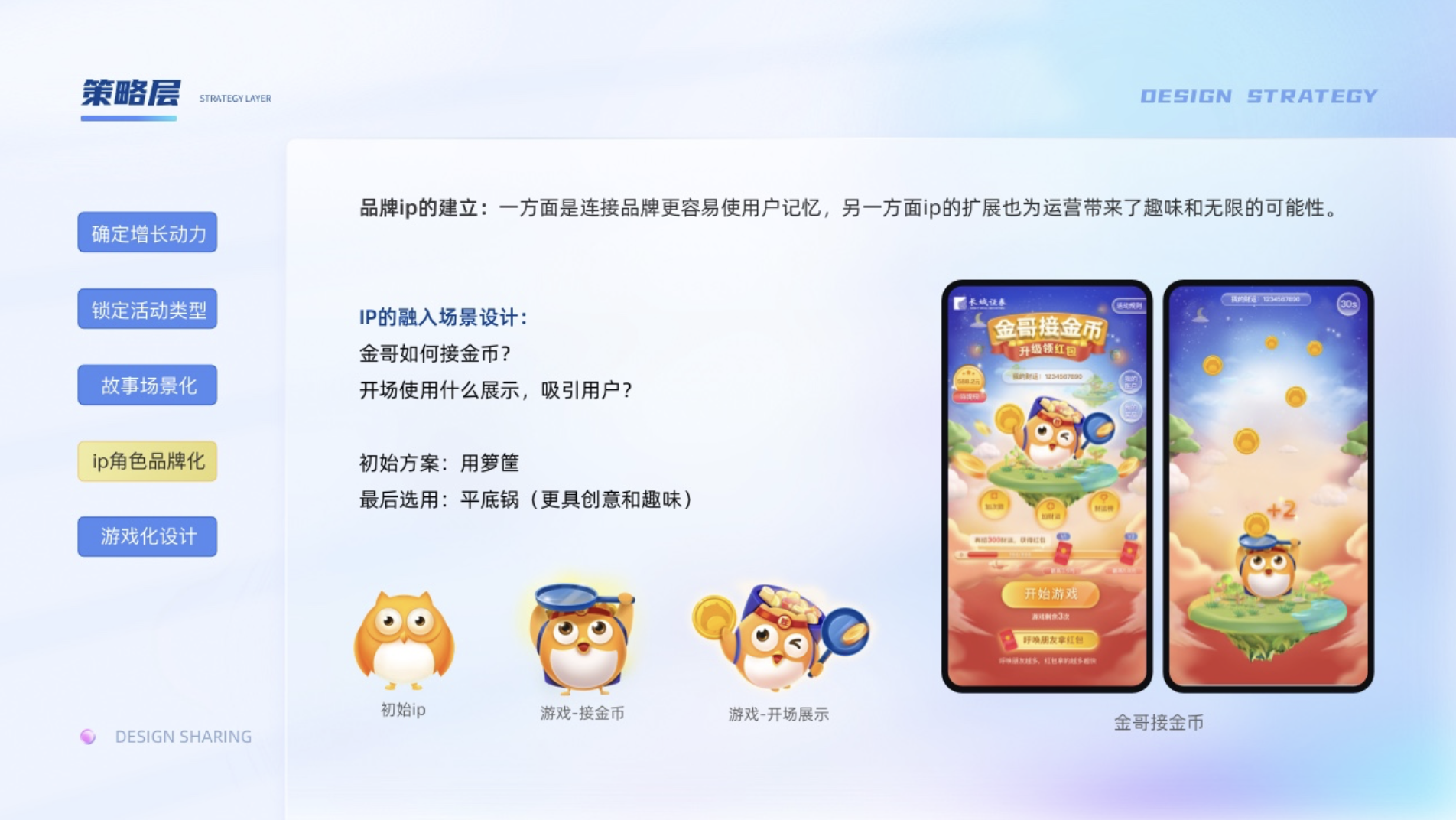 現(xiàn)在幾乎每個(gè)產(chǎn)品都有自己的ip,一方面是連接品牌更容易使用戶記憶,另一方面ip的擴(kuò)展也為運(yùn)營帶來了趣味和無限的可能性。ip的使用一是要保證ip的識(shí)別性,另一方便是需要很好的融入我們的故事場景。比如金哥他出現(xiàn)在我們接金幣的場景需要什么樣的裝束,使用什么動(dòng)作更好的連接到這個(gè)接金幣的故事場景中。一開始想著用籮筐去接金幣,但是籮筐體積大而高,會(huì)擋住ip,降低了ip的識(shí)別度。在設(shè)計(jì)的過程中突然靈光一閃,為了什么不用平底鍋呢,它除了打人,接金幣也不錯(cuò)。通過金哥頭頂平底鍋的接金幣方式,增添了整個(gè)游戲的創(chuàng)新性和趣味性,至于籮筐可以收納平底鍋接到的金幣,整個(gè)場景就很有邏輯性和畫面感了。同時(shí)為了凸顯游戲的氛圍,還給ip設(shè)計(jì)了頭帶必勝的綁帶的小細(xì)節(jié),和有沖擊力的動(dòng)作,增添了ip的生命力。