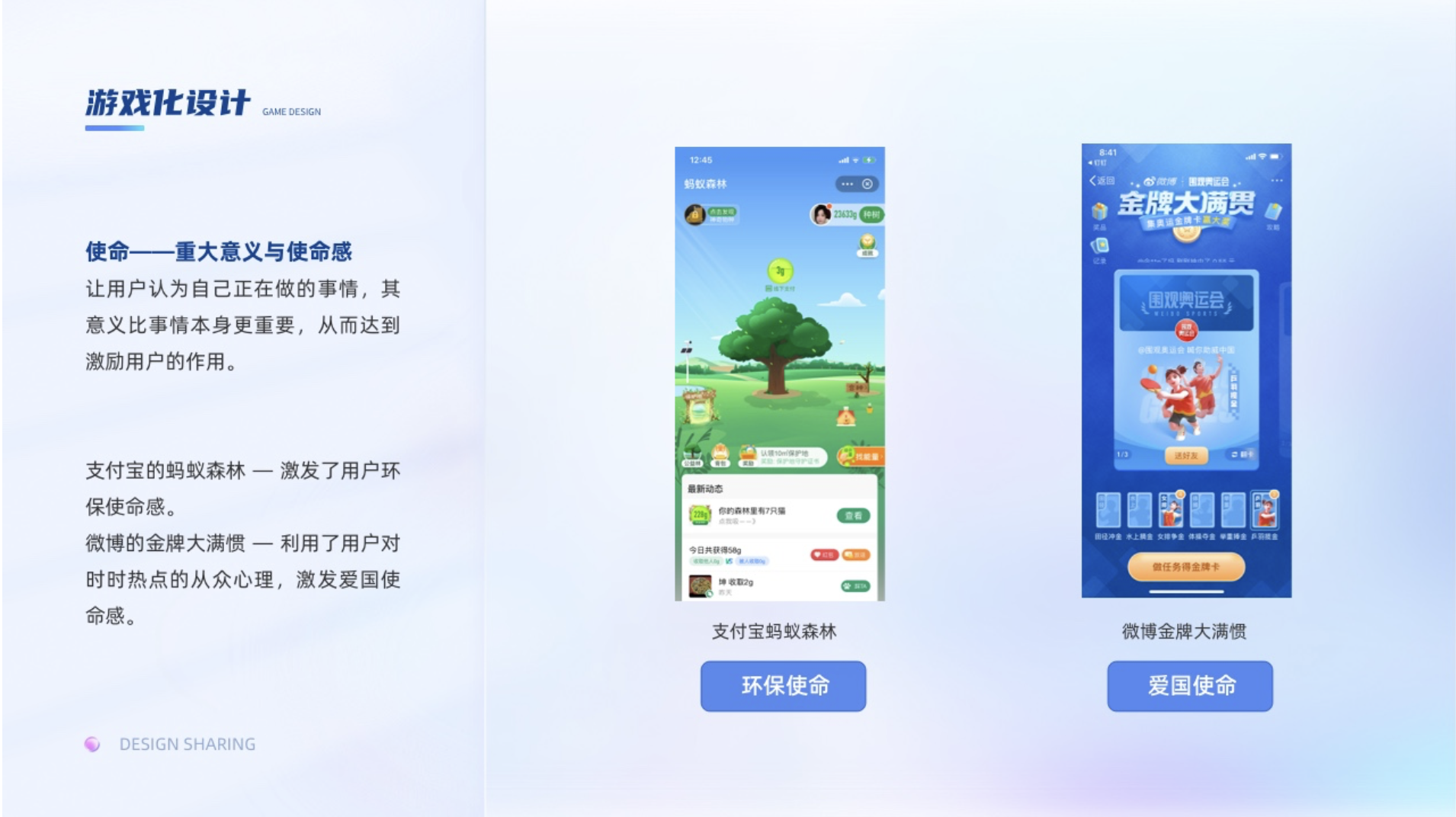 讓用戶認(rèn)為自己正在做的事情,其意義比事情本身更重要,從而達(dá)到激勵(lì)用戶的作用。譬如支付寶里面的螞蟻森林,種的不是樹,而是地球的一點(diǎn)綠,這個(gè)使命感瞬間油然而生,在玩的過程中還能幫助地球綠化,激發(fā)了用戶環(huán)保使命感。再比如在奧運(yùn)期間的微博的金牌大滿慣的活動(dòng),以圍觀奧運(yùn)會(huì)之名,集奧運(yùn)金牌卡喊你助威中國,利用了用戶對時(shí)時(shí)熱點(diǎn)的從眾心理,又聯(lián)系到了愛國上升了到了愛國使命感。