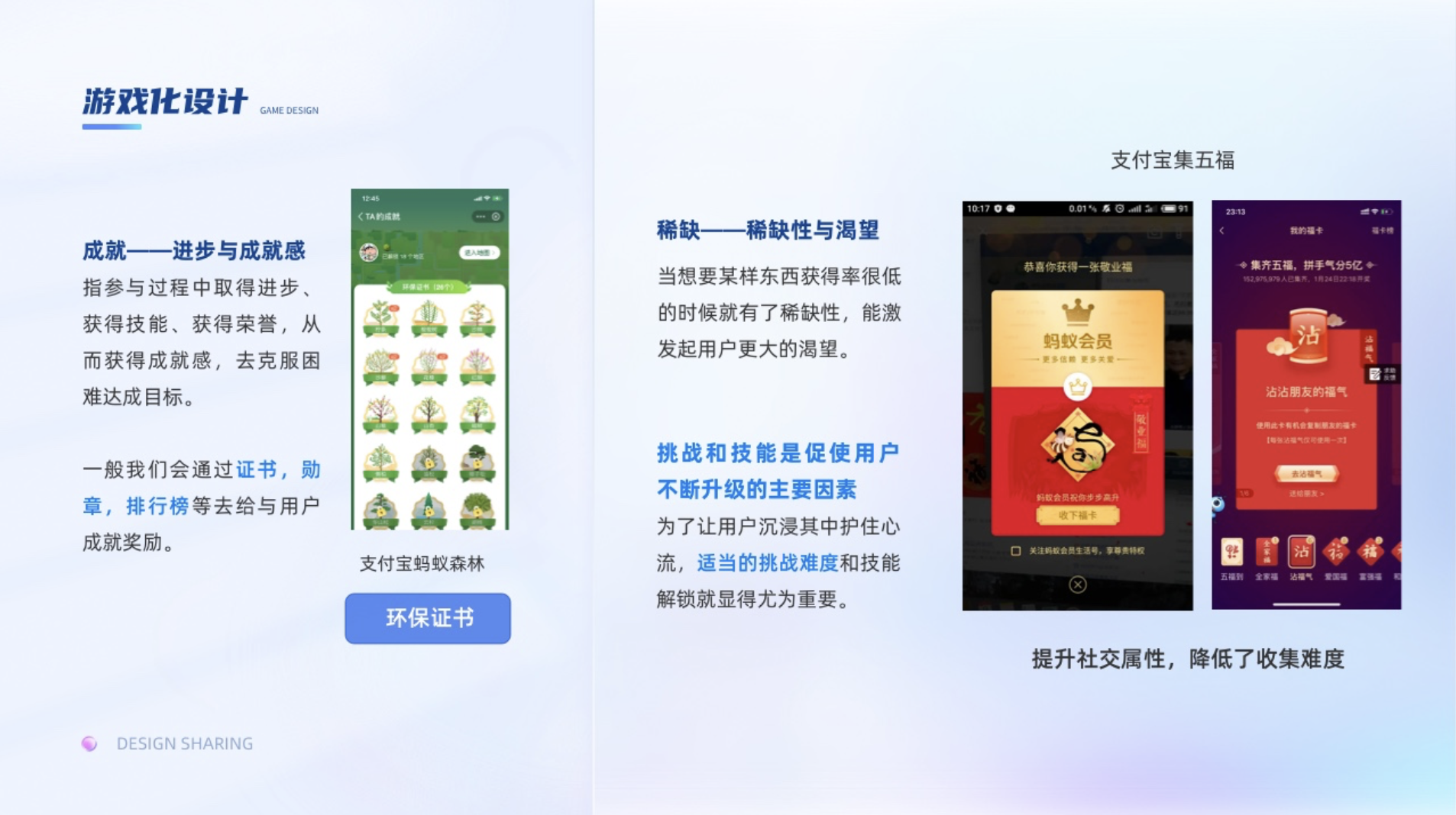 指參與過程中取得進(jìn)步、獲得技能、獲得榮譽(yù),從而獲得成就感,去克服困難達(dá)成目標(biāo)。一般我們會(huì)通過證書,勛章,排行榜等去給與用戶成就獎(jiǎng)勵(lì)。挑戰(zhàn)和技能是促使用戶不斷升級的主要因素,為了讓用戶沉浸其中護(hù)住心流,適當(dāng)?shù)奶魬?zhàn)難度和技能解鎖就顯得尤為重要。挑戰(zhàn)難度高了容易引起用戶的焦慮,難度低了又會(huì)讓用戶感覺無聊。比如集卡行動(dòng),在考慮總預(yù)算不變的情況下,如何設(shè)置稀有卡的比例,集卡的難度就尤為重要。支付寶集五福在初期,敬業(yè)福的比例比較低,所以用戶抽到敬業(yè)福的體驗(yàn)就很開心,但隨著支付寶后面為了擴(kuò)大社交屬性,提高了集齊率,集五到五福的興奮感就弱了,導(dǎo)致部分用戶失去動(dòng)力,因?yàn)榧降娜嗽蕉嗪罄m(xù)瓜分的錢就越少。