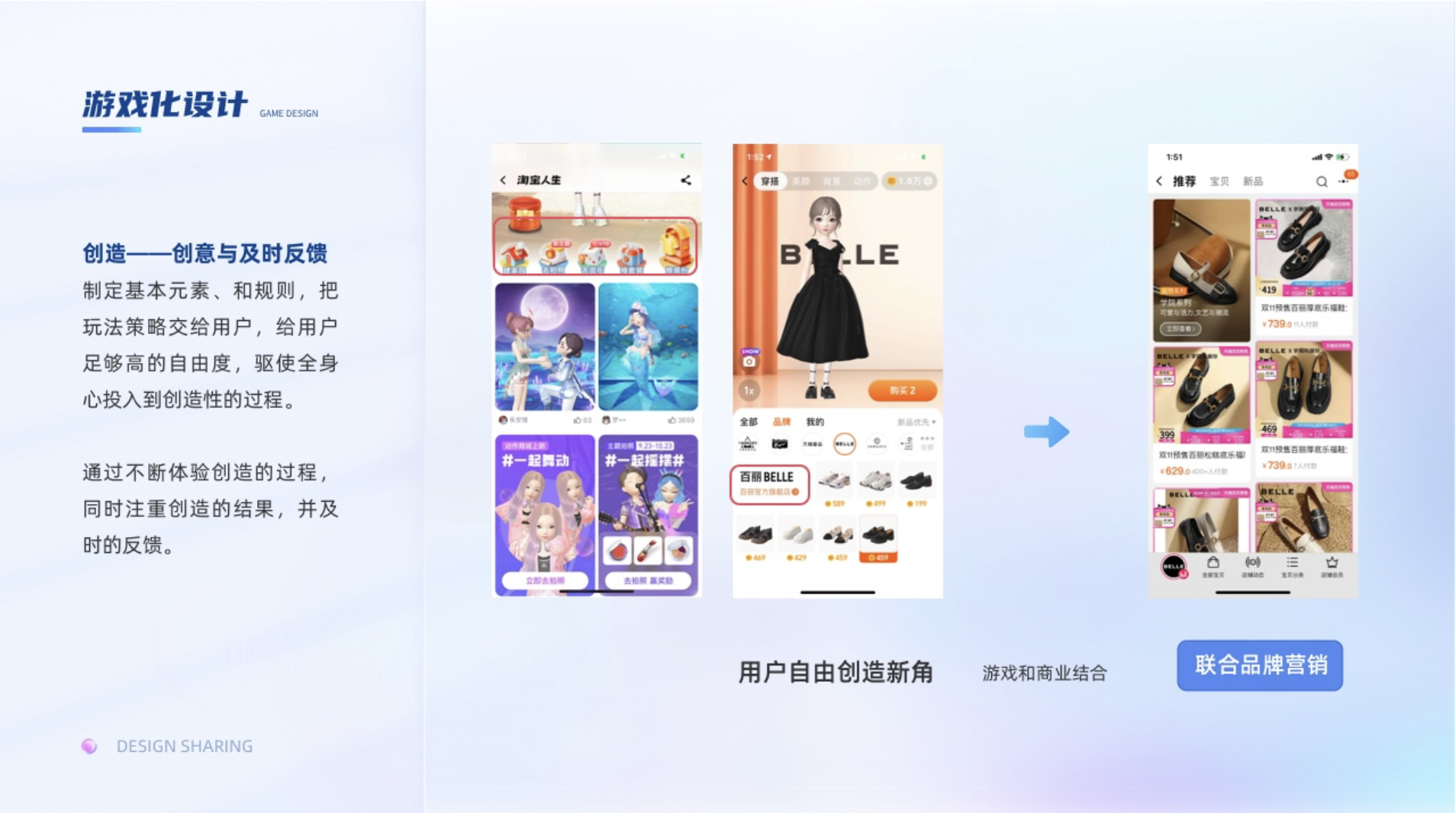 制定基本元素、和規(guī)則,把玩法策略交給用戶,給用戶足夠高的自由度,驅(qū)使全身心投入到創(chuàng)造性的過程。通過不斷體驗(yàn)創(chuàng)造的過程,同時(shí)注重創(chuàng)造的結(jié)果,并及時(shí)的反饋。比如淘寶人生,可以打造自己的形實(shí)質(zhì)上就是裝扮類的游戲,這種常駐型的游戲,不僅可以提高用戶使用產(chǎn)品的時(shí)長,還可以聯(lián)動(dòng)品牌做營銷提高下單率。其生命力的不竭動(dòng)力就源于,對用戶不斷提供創(chuàng)新的服裝、妝容、飾品、場景,讓用戶自由創(chuàng)造新角。