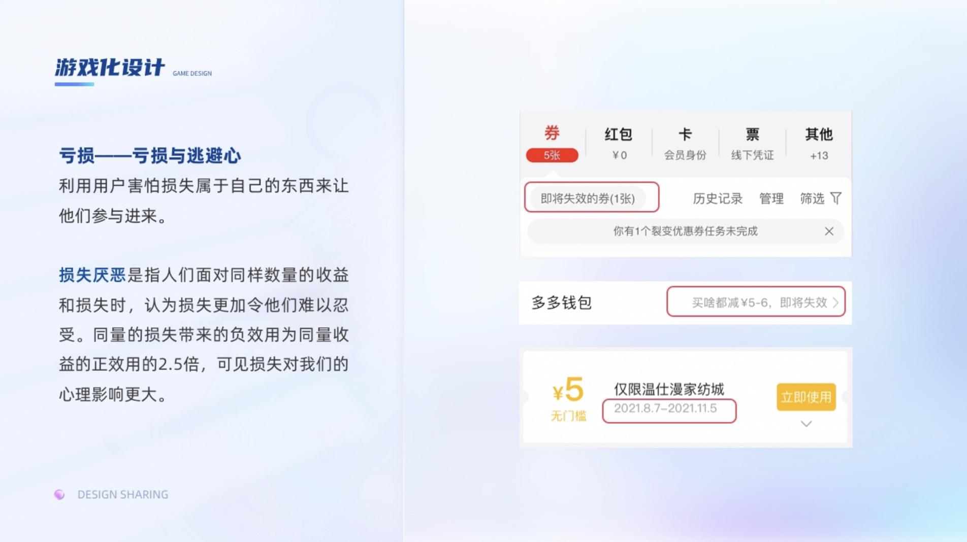 利用用戶害怕?lián)p失屬于自己的東西來讓他們參與進(jìn)來??梢越Y(jié)合損失厭惡來理解。損失厭惡是指人們面對同樣數(shù)量的收益和損失時(shí),認(rèn)為損失更加令他們難以忍受。同量的損失帶來的負(fù)效用為同量收益的正效用的2.5倍,可見損失對我們的心理影響更大。比如商家發(fā)給你的免費(fèi)優(yōu)惠券,其實(shí)你本身不需要購買什么,但是商家偏偏在優(yōu)惠券上加上時(shí)效性,超過活動(dòng)日期就置灰了,即使你原本沒有購買需求,但是感覺沒用掉優(yōu)惠券就像損失了優(yōu)惠券的錢一樣,就會(huì)去購買,甚至為了湊單購買更多東西。