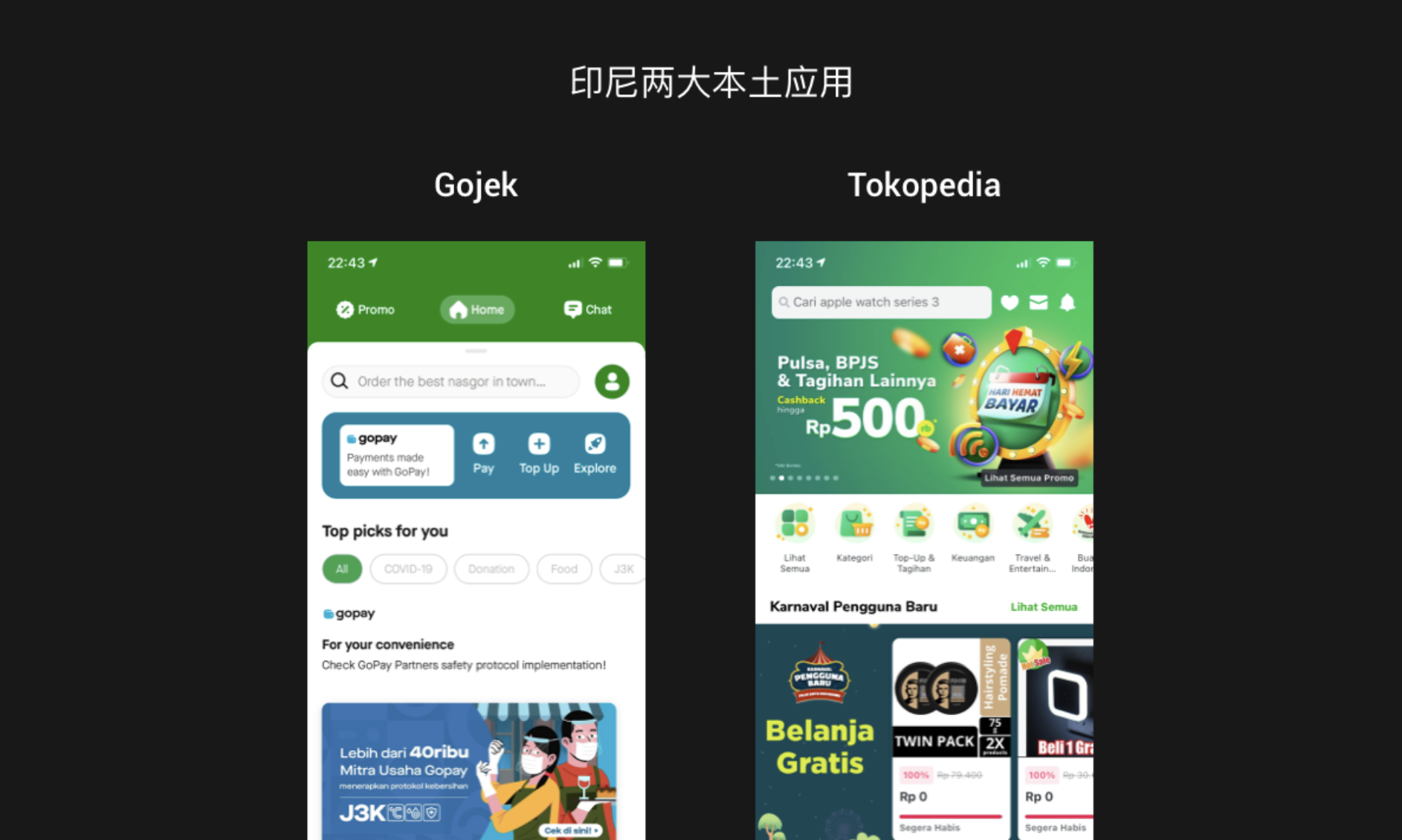 由于是穆斯林國家,綠色深受當?shù)厝讼矏?。在伊斯蘭教中,綠色象征著生命與自然。除了綠色,白色和藍色也是當?shù)厝嗣袼矏鄣念伾?。在選擇自己產(chǎn)品的主色調時,不妨參考這幾種顏色。下圖是印尼的兩大本土應用,Gojek 是當?shù)氐囊粋€超級 APP,提供出行、物流、食品、購物、支付等一站式服務,可以理解為是滴滴、美團、餓了么、支付寶、順豐等這些公司產(chǎn)品服務的集合,Tokopedia 是當?shù)氐碾娚唐脚_。兩家都選擇了綠色為主色調,這是因為創(chuàng)始人有虔誠的信仰,在伊斯蘭教中,綠色通常被認為是伊斯蘭教的象征。