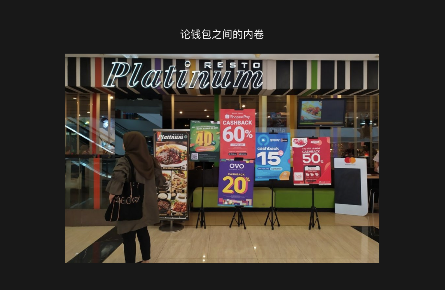 另外,當?shù)氐闹Ц斗绞揭卜浅6鄻踊谟∧岙數(shù)?,可以看到滿大街關于錢包的 cashback 廣告。目前印尼主流的錢包支付有 GO-pay、OVO、Dana、LinkAja、ShopeePay。