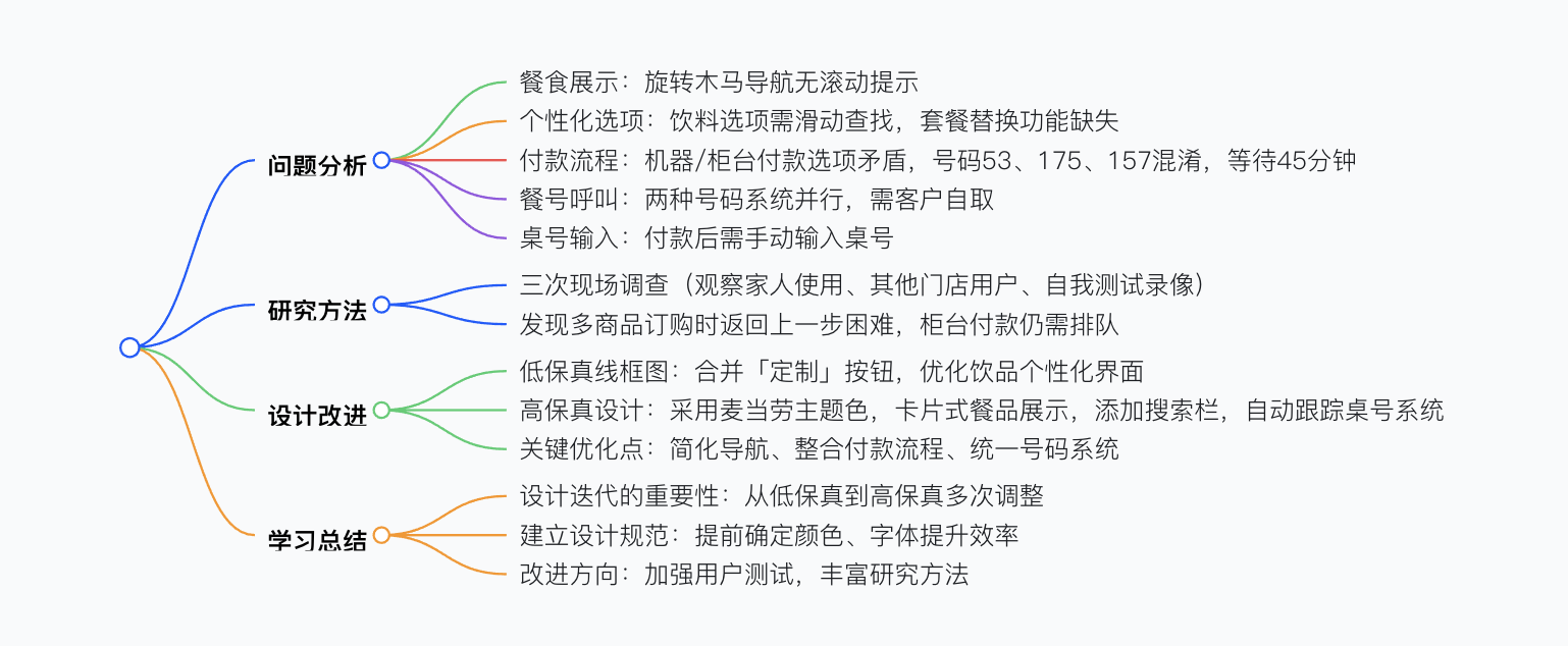本文圍繞麥當勞自動點餐系統(tǒng)的用戶體驗展開分析,指出其在餐食展示(無滾動提示)、個性化選項(需手動滑動才能看到更多)、付款流程(存在 53、175、157 三個混淆號碼,導致 45 分鐘等待)、餐號呼叫系統(tǒng)(兩種號碼并行)、桌號輸入等環(huán)節(jié)存在問題。作者通過三次現(xiàn)場調(diào)查,基于用戶畫像和故事板構建解決方案,經(jīng)低保真與高保真原型迭代,重新設計了菜單展示、個性化選項流程及付款系統(tǒng),最終強調(diào)設計中反復測試和建立規(guī)范的重要性。
