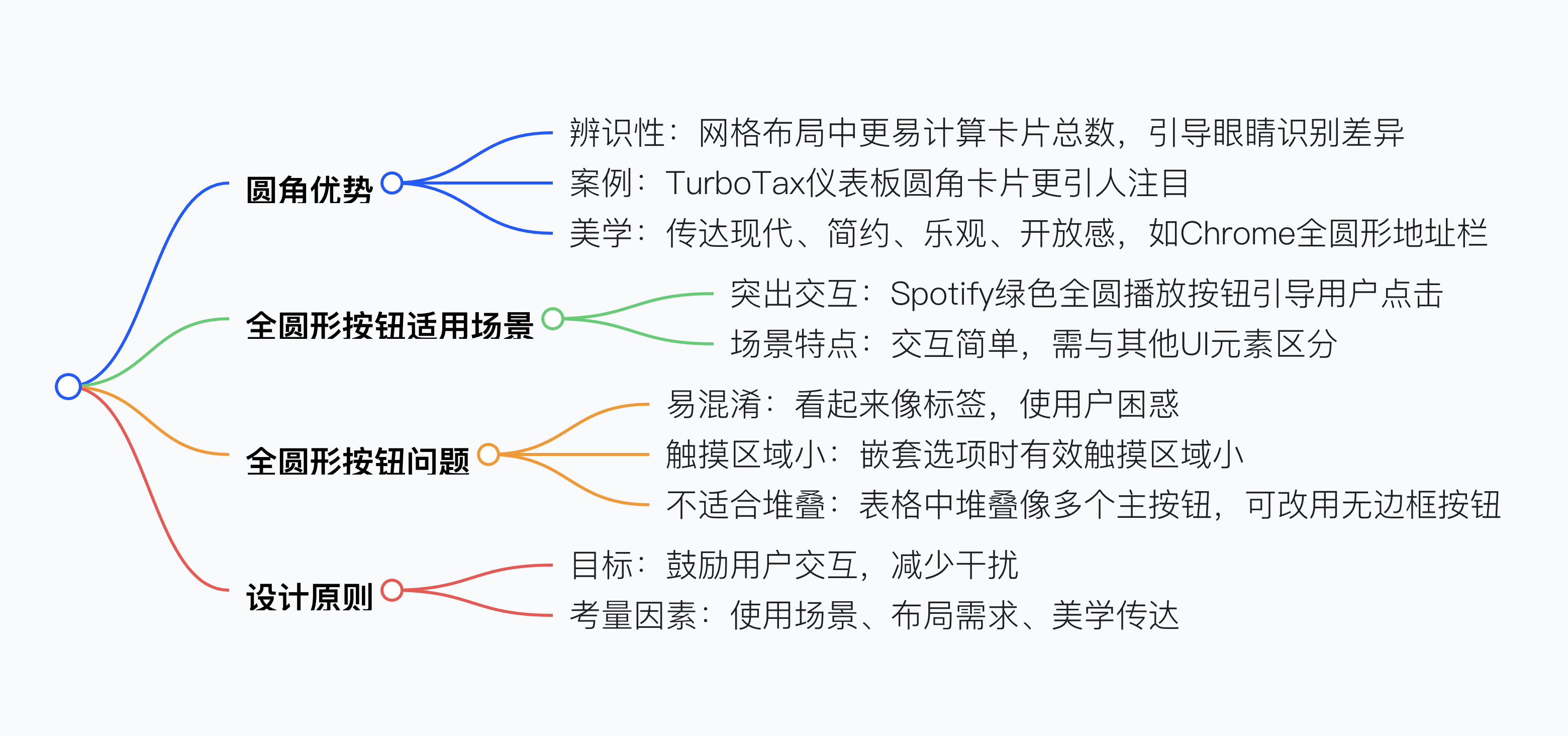 UI 設(shè)計(jì)中按鈕用圓角還是直角需綜合考量,圓角在網(wǎng)格布局中更易辨識(shí),如 TurboTax 儀表板中圓角卡片比尖角更引人注目,全圓形按鈕在 Spotify 中因突出交互引導(dǎo)成功,但全圓形按鈕可能被誤認(rèn)標(biāo)簽、嵌套選項(xiàng)觸摸區(qū)域小、不適合堆疊,而直角按鈕在表格等堆疊布局中更合適,此外圓角傳達(dá)現(xiàn)代、簡(jiǎn)約等感覺(jué),像 Chrome 瀏覽器更新為全圓形地址欄,總之設(shè)計(jì)需以鼓勵(lì)用戶(hù)交互、減少干擾為目標(biāo),而非單純選擇圓角或直角。