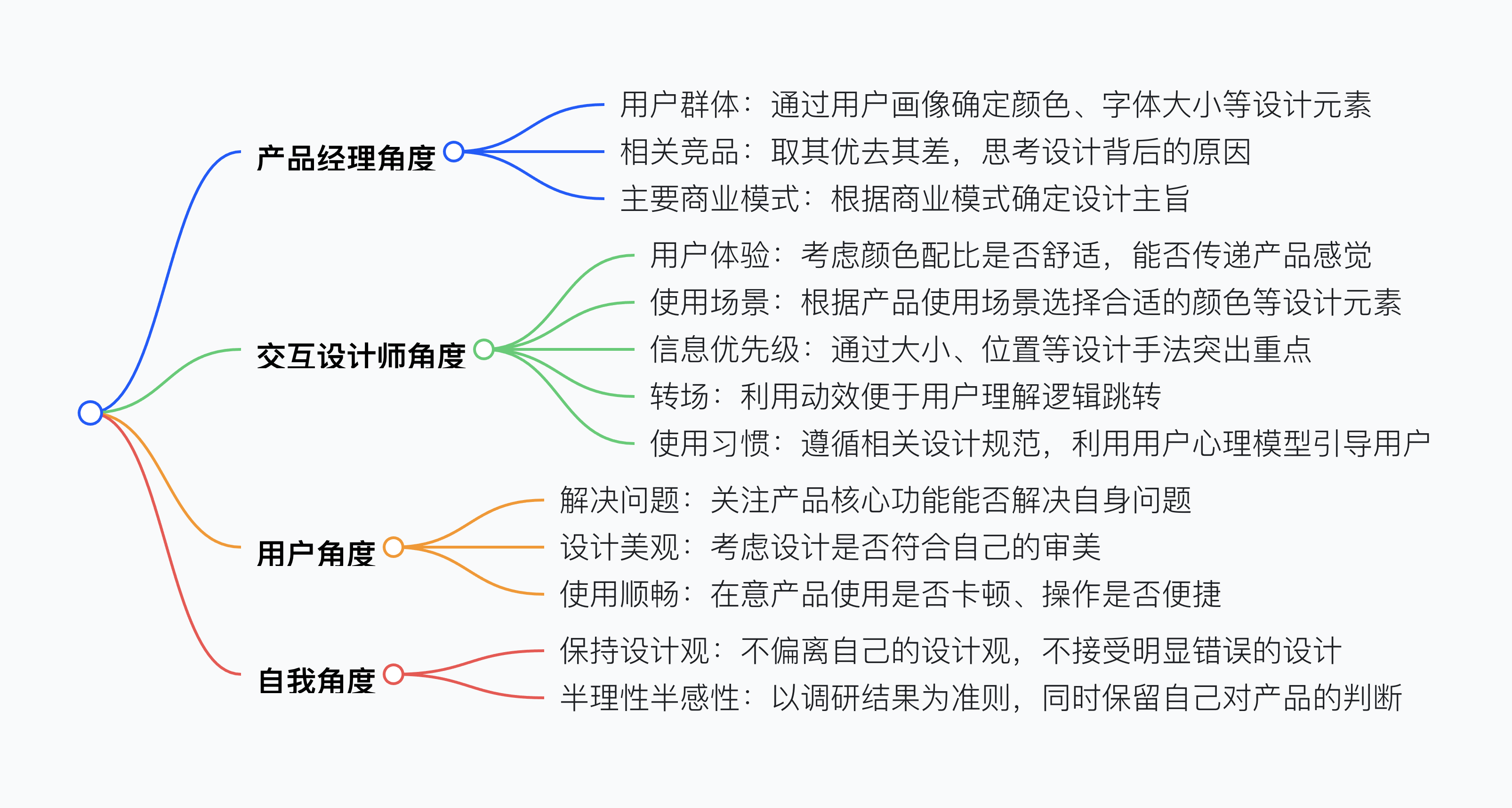 UI 設(shè)計(jì)需從產(chǎn)品經(jīng)理、交互設(shè)計(jì)師、用戶和自我這 4 個(gè)角度思考:像產(chǎn)品經(jīng)理一樣關(guān)注用戶群體、相關(guān)競品、主要商業(yè)模式;像交互設(shè)計(jì)師一樣考慮用戶體驗(yàn)、使用場景、信息優(yōu)先級(jí)、轉(zhuǎn)場、使用習(xí)慣;像用戶一樣思考產(chǎn)品能否解決問題、設(shè)計(jì)是否美觀、使用是否順暢;像自己一樣保持設(shè)計(jì)觀,不盲目接受錯(cuò)誤設(shè)計(jì)。如此才能做出符合用戶需求且有自己韻味的設(shè)計(jì)。