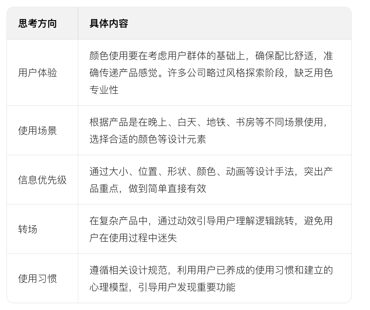 - 答案:交互設(shè)計(jì)師角度的思考包括用戶體驗(yàn)、使用場景、信息優(yōu)先級(jí)、轉(zhuǎn)場、使用習(xí)慣等方面。在用戶體驗(yàn)上,影響顏色配比的舒適性和對(duì)產(chǎn)品感覺的傳遞;在使用場景上,決定設(shè)計(jì)元素是否符合產(chǎn)品使用環(huán)境;在信息優(yōu)先級(jí)上,指導(dǎo)如何通過設(shè)計(jì)手法突出重點(diǎn);在轉(zhuǎn)場上,幫助用戶理解邏輯跳轉(zhuǎn);在使用習(xí)慣上,利用用戶心理模型引導(dǎo)操作,這些都能提升 UI 設(shè)計(jì)的實(shí)用性和用戶體驗(yàn)。
