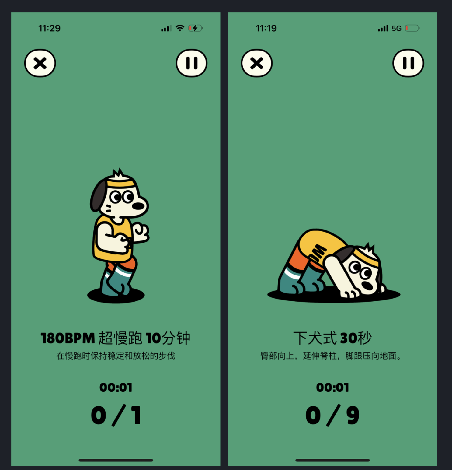 打開 Rumbo,全程有個圓滾滾的卡通角色跟著你:做 “下犬式” 時(shí),它會同步擺出同款姿勢,還會用萌萌的語氣提示 “腳跟再往下壓一點(diǎn)哦”;完成一組動作,它會搖著尾巴給你點(diǎn)贊。這個 IP 形象不是簡單的裝飾 —— 它把 “一個人運(yùn)動” 變成了 “和小伙伴一起打卡”,減少了用戶的孤獨(dú)感;甚至有用戶說 “為了看它夸我,都愿意多練 5 分鐘”。