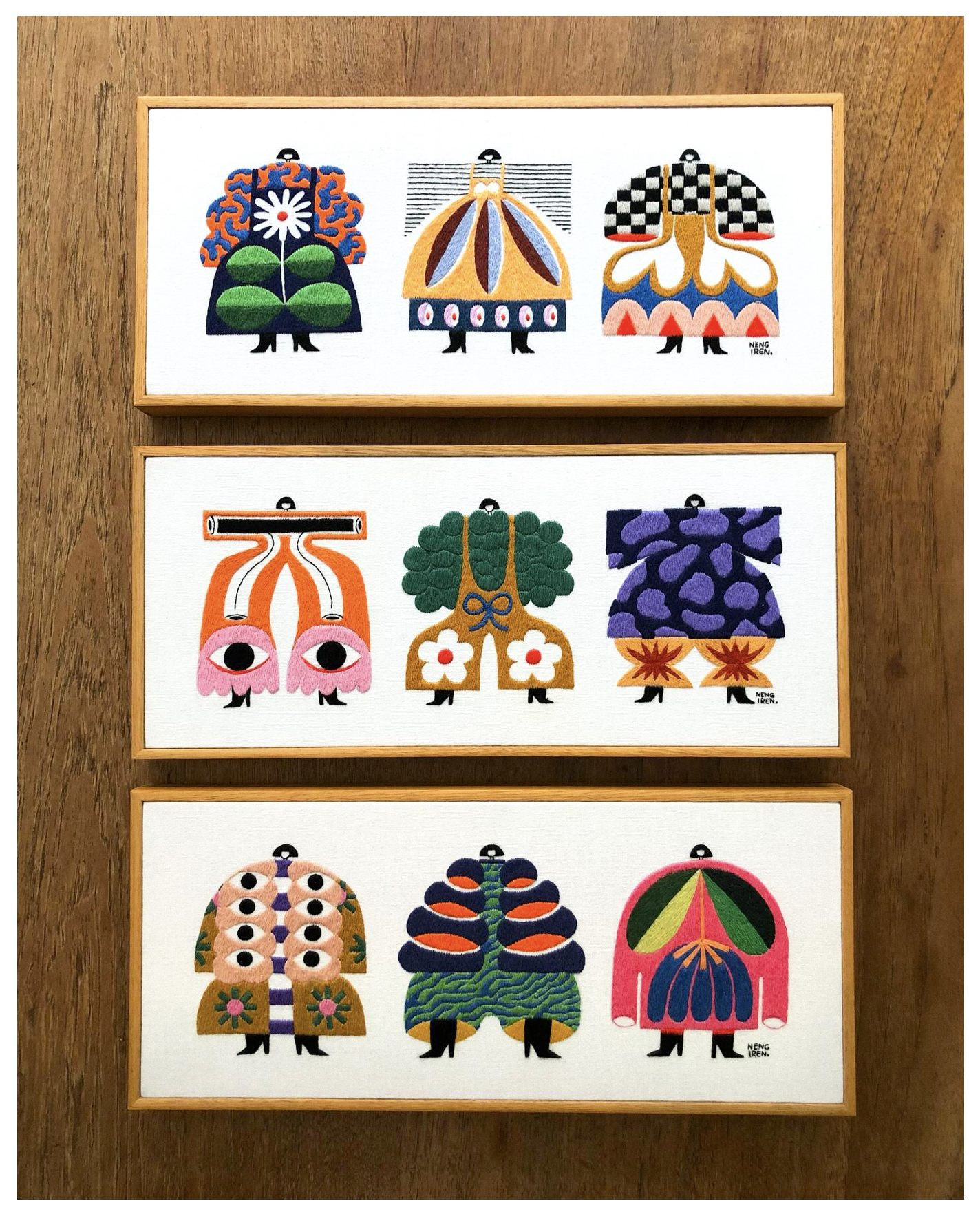 當(dāng)一根緞面繡線在棉布上蜿蜒,勾勒出娃娃領(lǐng)的弧度;當(dāng)幾何色塊與鮮艷針腳碰撞,撐起一件迷你裙擺 —— 印尼藝術(shù)家 Irene Saputra(藝名 Nengiren)正用最傳統(tǒng)的刺繡工藝,做著最時髦的 “角色穿搭實驗”。她筆下的 “nona kecil”(印尼語 “小女孩”)系列,不是靜態(tài)的玩偶,而是每天都有新造型的 “時尚 Icon”,在針與線的交錯間,完成了手工藝與現(xiàn)代時尚的溫柔對話。
