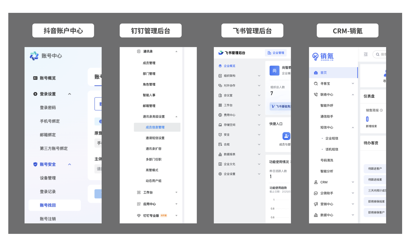 - 寬欄(混合導航):圖標與文字并存,支持多級菜單嵌套,是最常見的側(cè)邊欄樣式。通過分組標題和分割線提升信息密度,兼容性強,適合業(yè)務復雜、功能模塊較多的系統(tǒng),如抖音賬戶中心、飛書管理后臺、釘釘管理后臺等。