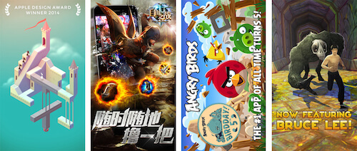 對游戲應(yīng)用來說,你的主要目標(biāo)是調(diào)動起用戶的情緒(而不是展示功能)。選擇游戲中史詩般的場景和驚心動魄的畫面去凸顯游戲的樂趣。讓用戶在安裝這個app以前就能夠所感受到快樂的預(yù)感;用標(biāo)題講故事,通過展示徽章和獎勵來吸引玩家。