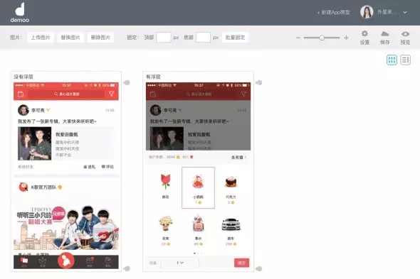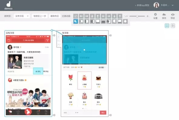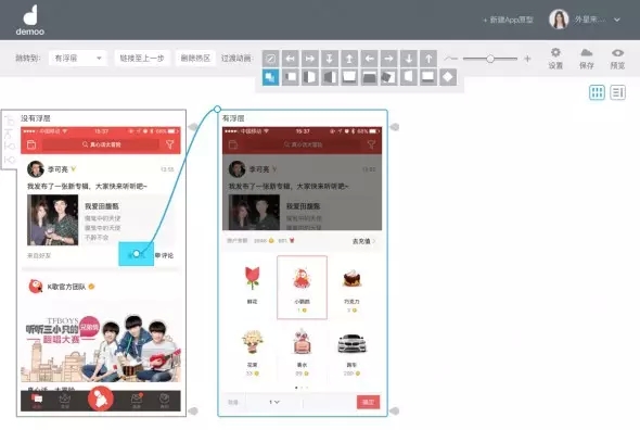 最后,聽說很多試用過的朋友都在詢問,如何在Demoo中模擬浮層的效果,Demoo其實(shí)更擅長的是頁面之間的跳轉(zhuǎn),那么如何模擬呢?這里給大家一個(gè)小技巧。
