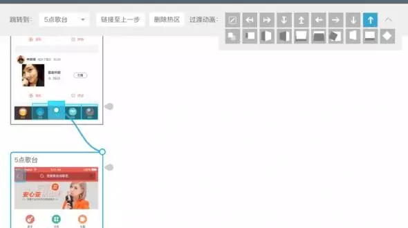 真實(shí)的app中,頁面間常常通過方向來示意層級關(guān)系,例如重新創(chuàng)建的流程,通常創(chuàng)建頁面會從底部向上呼起,于是,在建立熱區(qū)鏈接過程時(shí),我們需要對鏈接進(jìn)行方向設(shè)定。如圖示,我將點(diǎn)歌臺呼起的頁面出現(xiàn)形式,設(shè)定為從下往上出。如果不是很確定切換效果,Demoo很細(xì)心的在這里設(shè)計(jì)了動(dòng)畫預(yù)覽,鼠標(biāo)停留在小方塊上時(shí),會有微動(dòng)畫示意,多看幾遍也就明白了。