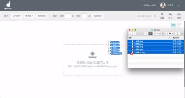 在設(shè)計(jì)工具中,我已經(jīng)設(shè)計(jì)好了全民K歌5個(gè)主要頁面的圖并命名好保存在文件夾中,準(zhǔn)備開始制作原型。如圖所示,Demoo支持批量導(dǎo)入圖片,將我需要的圖片全部選中,拖放到虛框內(nèi),即可完成圖片導(dǎo)入工作。導(dǎo)入后,就相當(dāng)于你已經(jīng)把a(bǔ)pp原材料都放到工作臺啦,之后操作起來就會特別方便。