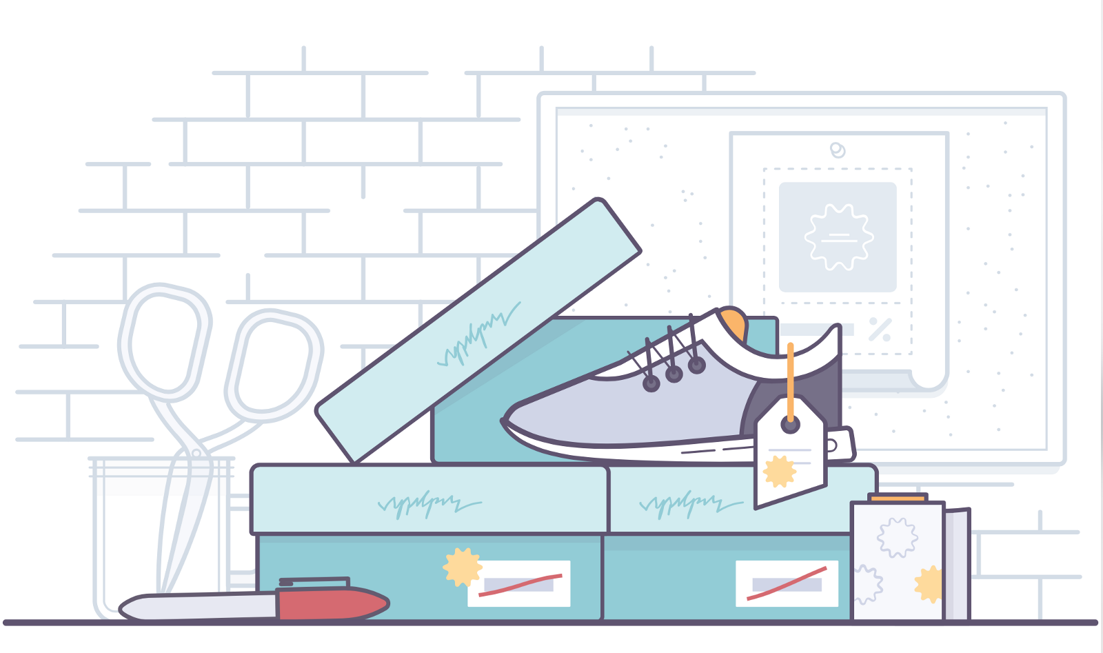 這個元素在線上和線下有相似之處。盡管我不認為它是一類比喻,但在產(chǎn)品設計中我還是將它單獨拿出來說。比喻常用來展現(xiàn)觸動人心的部分,那是一件事情或者一個行動產(chǎn)生的積極感覺。不過,對于內(nèi)容傳遞給用戶的方式,團隊更傾向于中立的寫實表達。不必告訴用戶我們的感受如何,只需簡潔傳達信息。用插畫的專業(yè)術(shù)語來表達則是:我們只愿意通過繪制寫實狀態(tài)下的物品,來幫助用戶理解線上的內(nèi)容。當然,談到產(chǎn)品時,我們大多是在電腦上作畫,比如,你可以繪制20多個互相連接的空狀態(tài)頁面,來表達重復性。這也是我們在為用戶傳達內(nèi)容時增加的一種類比方式。比如下圖的例子,線上電子商務可以讓用戶通過優(yōu)惠碼輸入實現(xiàn)折扣,那么線下實體銷售折扣該如何表達呢?可能是一堆貼紙和帶著折扣價格的紅色標記。我們能借助全新懷舊風格的插畫為用戶帶來愉悅,同時還能保持中立,只是簡單清晰的表達信息。
