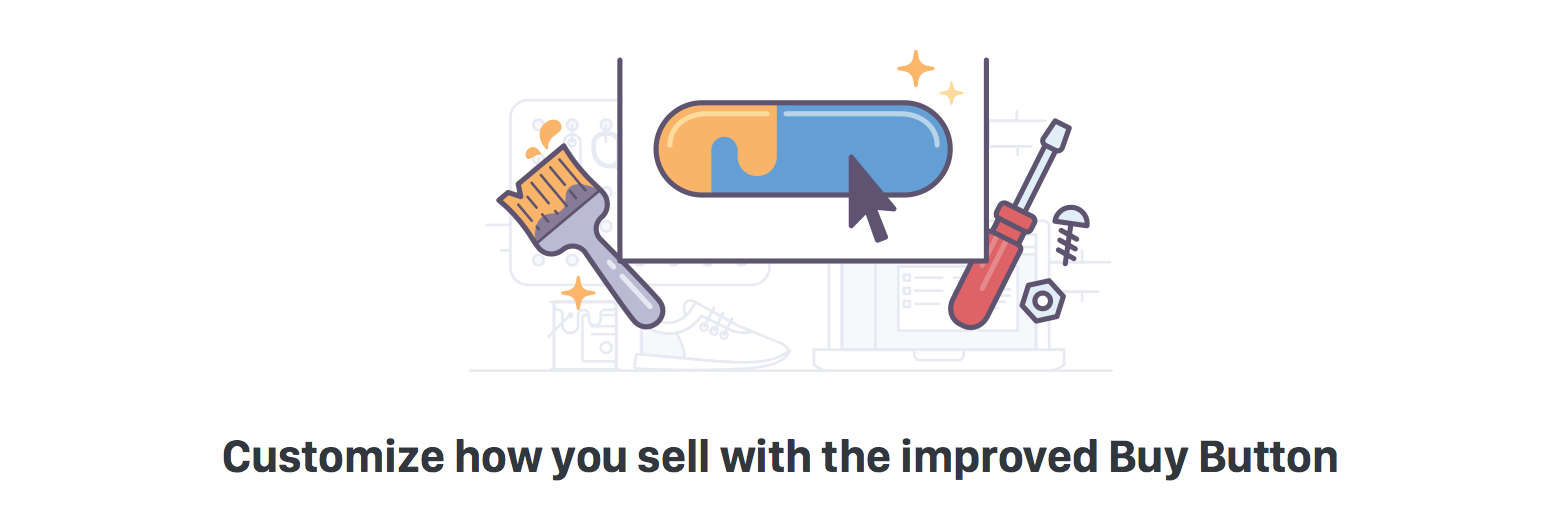 這個元素與那個元素融合,就能表達我們想要傳遞的內(nèi)容??赡苓@類比喻使用起來需要更老道的經(jīng)驗,但在產(chǎn)品插畫里的確更受重視,或者說一般設計都會考慮它,因為它是讓用戶獲知你的產(chǎn)品或功能賣點的捷徑。如下圖所示,沒錯,你知道我們提供了“購買”的按鈕,但瞧瞧旁邊擺放的畫筆,基于對畫筆的了解,你就會明白你能定制“購買”按鈕的顏色。將刷子的功能與按鈕的功能混合起來,刷子可以自定義顏色,因此我們的按鈕也可以。與品牌和營銷設計一樣,這種比喻在圖標設計中也時常出現(xiàn)。
