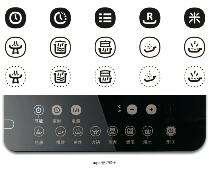 蘇泊爾標(biāo)識(shí)系統(tǒng)吸收了米字格和“永字八法”,將所有圖標(biāo)元素看作是漢字的八個(gè)筆畫(huà),運(yùn)用八個(gè)筆畫(huà)元素按照“米字格”的網(wǎng)格系統(tǒng)再組合,設(shè)計(jì)出蘇泊爾標(biāo)識(shí)系統(tǒng)的所有標(biāo)識(shí)。