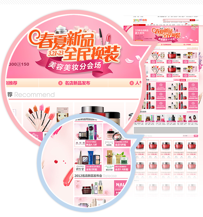 3月促化妝品分會場運(yùn)用粉紅色為主色調(diào),更容易讓人聯(lián)想到粉嫩的肌膚和絢麗的彩妝。大背景使用護(hù)膚品和彩妝用品的特寫展現(xiàn)美容用品的美感,烘托賣場氛圍。