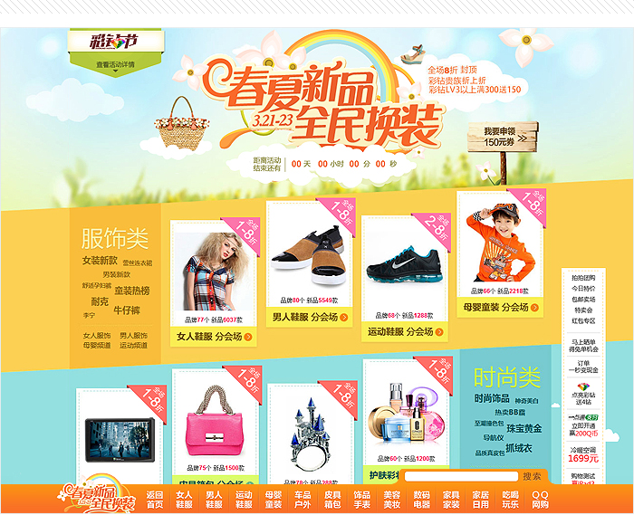 拍拍3月的大型促銷活動《春夏新品,全民換裝》,主會場設(shè)計上運(yùn)用明快、鮮艷的春夏色彩塊組合,在細(xì)節(jié)上采用花朵草地藍(lán)天更加突顯初春購物的輕松氛圍。并在活動頭部主畫面中采用HTML5+CSS3實(shí)現(xiàn)的酷炫動畫,為用戶帶來了全新的頁面體驗(yàn)。