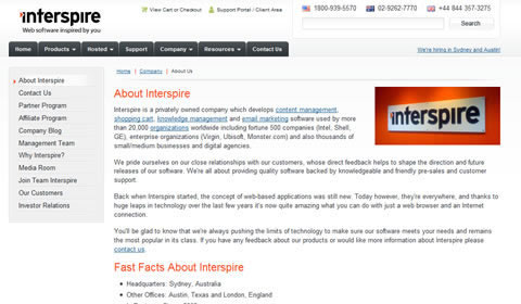 當(dāng)你在設(shè)計(jì)中克制而明智地使用色彩時(shí),吸引訪客對(duì)重要項(xiàng)目的注意力就變得相當(dāng)容易。在 Interspire 的 “About Us(關(guān)于我們)” 頁面中,訪客的注意力被迅速吸引到頁面頂部LOGO那紅色的一點(diǎn)上,然后是標(biāo)題,然后是頁面右邊的LOGO照片。