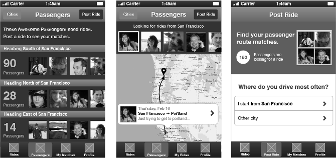 首先,我們分析了駕車者通常會(huì)出于怎樣的目的來(lái)發(fā)起拼車活動(dòng),并將這些原因列成一份清單。接下來(lái),我(英文原文作者)對(duì)應(yīng)著這份清單繪制了一些簡(jiǎn)單的草圖,將有可能符合駕車者需求的功能和內(nèi)容初步的勾勒出來(lái)。然后,大家對(duì)這些草圖進(jìn)行討論評(píng)估,將其中我們認(rèn)為最可行的5個(gè)概念進(jìn)一步落實(shí)到線框原型當(dāng)中,并向一些目標(biāo)用戶(獨(dú)自駕車者)進(jìn)行了展示,通過(guò)他們的反饋來(lái)驗(yàn)證我們的假設(shè)。