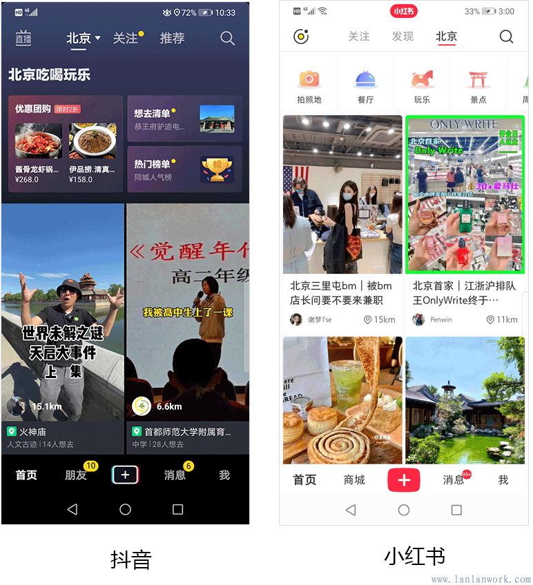 感覺小紅書比什么抖音吸引我(在沒有搜索之前推薦的東西就很吸引我),小紅書里可以學(xué)到很多東西,廚藝、書法、服裝搭配、園藝、家居、展訊,推薦的東西基本上是我感興趣的。其實(shí)這兩個(gè)APP的內(nèi)容本身都是很全的,小紅書在發(fā)現(xiàn)和北京欄目頁面是2行2列,一頁可以展示4個(gè)視頻內(nèi)容和標(biāo)題,節(jié)省了刷屏選擇的時(shí)間,相對(duì)高效。